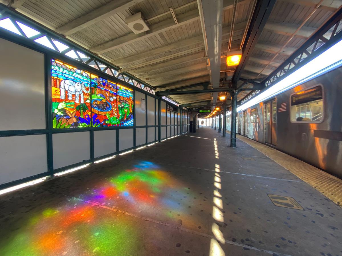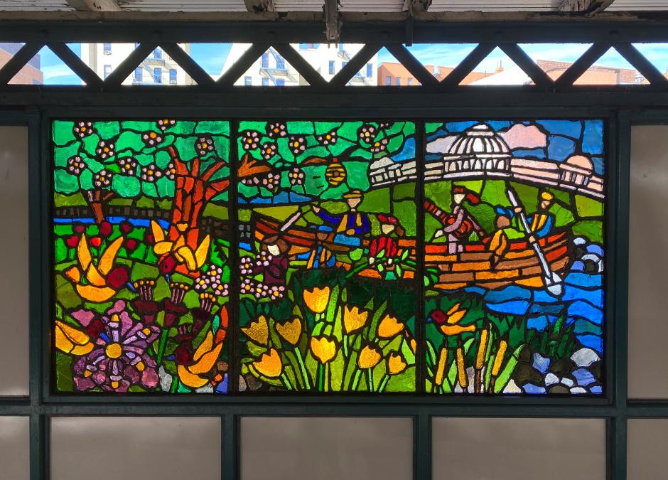 “A Trip Up the Bronx River” consists of ten faceted glass panels that depict a small group canoeing upstream and visiting such famous sites as the Bronx Zoo and the New York Botanical Garden. En route, the party passes various neighborhoods, filled with color, pattern, and activity. For this work, the artist Daniel Del Valle also presents typical activities in which the community participates, such as a street festival, mask-making, and the planting of new trees. Representations of flowers can be found in the station window niches, as "simple reflections of nature that surrounds us," according to Del Valle. "Even though not everyone can take this magical trip up the river to view these sites, the 2 and 5 trains can provide people easy access to travel to these locations."