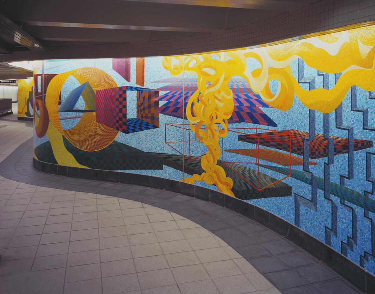 “Passing Through” is one of the last public works of celebrated abstract painter Al Held – it was in the process of being installed at the time of his death. The colorful and exuberant mural reveals an immense universe in which geometric elements of varying shapes and sizes float freely. In the 1960s, Held moved from abstraction to tightly controlled geometric work, with two-dimensional figures suspended on the canvas. Held was curious about how everything is structured and was inspired by theories about the universe and its mysteries. He described his interest in "images that we believe in but that are beyond our senses and that we can never experience directly." There is also another subject, that of buildings and architecture. His imagery powerfully evokes New York City's energy while acknowledging the forms and styles of the Midtown skyscrapers overhead.
