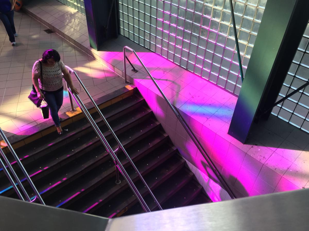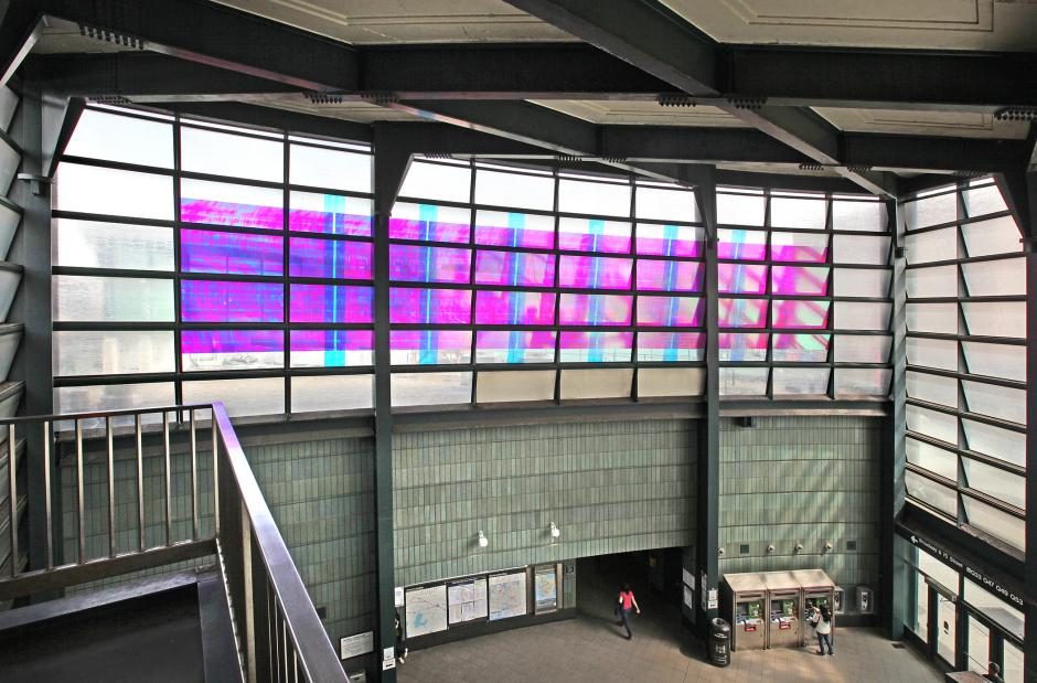 “Passage” was designed by Tom Patti in tandem with the architects, FX + FOWLE, as an integral part of the station. It features trapezoidal-shaped windows fitted into the steel so they can be opened and allow air into the platform. The laminated, impact-resistant security glass is layered with a plasma composite material to break up light into the colors of the spectrum. Patti said that “Passage” is influenced by the markets, flowers, and colors on the nearby streets. Patti pioneered the integration of industrial and architectural glass into art. "The ability of glass to occupy several physical states - transparent, opaque, dense, solid, weightless - all altering our spatial boundary - challenges me," he said. All the components of “Passage” were handmade in his studio. For Patti, this act of craftsmanship was critical to ensure the integrity of all elements.