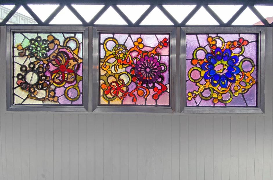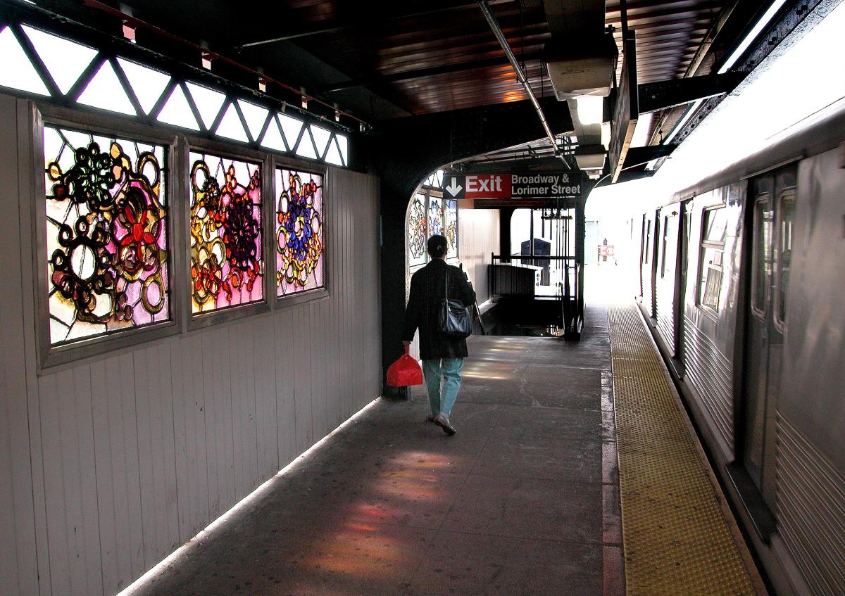 Annette Davidek's murals at Lorimer St station in Brooklyn illustrate the fractured and fragmented language of nature in a medium well-suited for her expressive work. “Roundlet Series” reveals the countless varieties of organic forms in botany. At times the murals recall blossoming flowers, twisting branches, or meandering patterns that mimic genetic elements. The challenge in translating the artist's works on paper into faceted glass murals was to capture the detail and complexity of the compositions while maintaining the captivating qualities. Faceted glass delivers a striking quality of translucency, texture, and range of color. Dramatic contrasts between the contour and the content become apparent against the background and the result adds vibrancy to the station platform.
