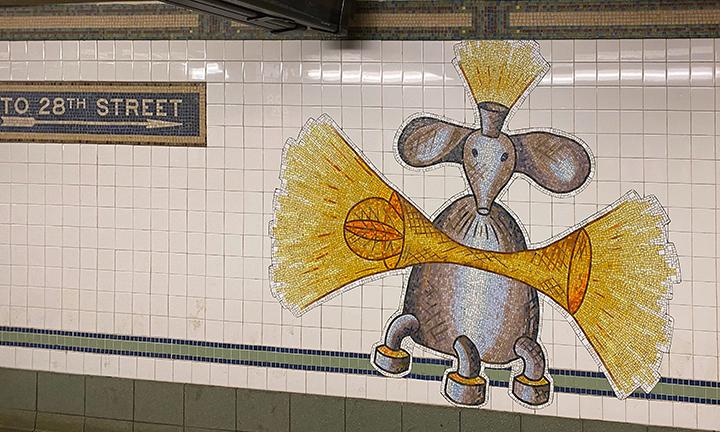 The Toy Center and the Flatiron Building are located near the 28 St subway station and Broadway, as are the flower, fur, and garment districts. Each of these areas inspired artist Mark Hadjipateras, whose glass mosaics are rendered in a playful cartoon-like style. “City Dwellers” animates the walls of the station with a series of robot-like creatures. The figures are joyous and fanciful, but closer examination reveals universal symbols and forms that reflect the neighborhood and its history: technology, toys, and commerce. These inventions invite riders to guess at their meanings; while they may seem familiar, the artist holds the key. In his proposal, Hadjipateras cited some of his plentiful sources: plants and flowers, patterns based on national flags, Greek ethnic garb, family, New York taxis, radio broadcast waves, and more. Filtered through the artist's sensibility, the result is a unique and compelling station environment.