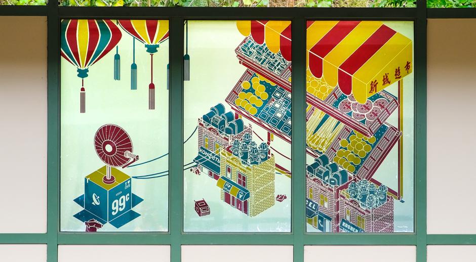 Combining hand drawing and digital illustration, Jeyifous captures iconic food practices that reflect the diverse cultural make-up of the neighborhood. Food items such as dumplings, egg tarts, kebabs, tacos, churros, borscht, and lasagna are morphed into building facades, store fronts, mailboxes, fruit stands, and subway cars. Imagery captured from the surrounding neighborhood is rendered into simplified, graphic shapes in vibrant hues.
