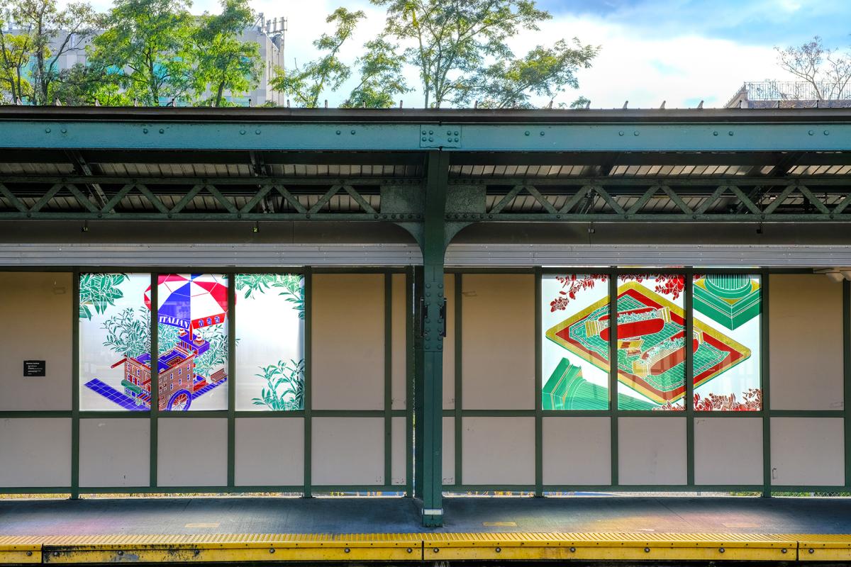 Olalekan Jeyifous’ artwork for the 8 Av station explores connections between culture, architecture, and food found in Brooklyn's diverse Sunset Park neighborhood. The artwork, "Made With Love," is a series of 28 triptych compositions that combine architectural and urban elements of the neighborhood with culinary dishes known and loved by the local community and visitors.