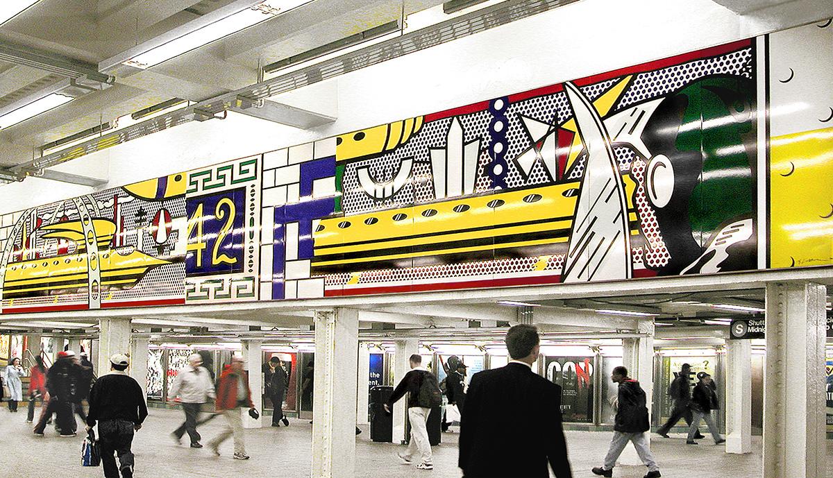 Roy Lichtenstein was born in New York in 1923 and spent his last years in the city. "Times Square Mural" reflects his career, with references to and variations on his earlier works. Lichtenstein also freely appropriated and incorporated images from the works of other artists and designers in his work. For instance, the hooded figure at the right of the mural is from the old Buck Rogers comic strips, while the iconic "42" image is from a series of drawings of the architectural detail of the subway. It is a signature work that honors its creator and the place in which it is located.