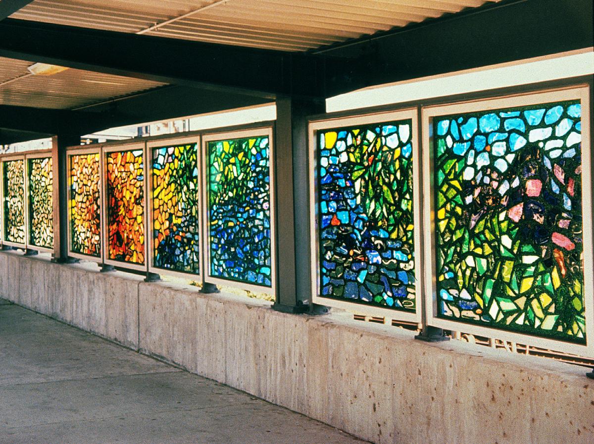 “Tranquility” features 12 faceted glass windscreen panels at the Mount Vernon station. Together the panels convey the shimmering quality of Impressionism in stained glass. The artwork creates the atmosphere of the country through the artist’s imagery and color palette. As its title implies, the work is calming in its depiction of a natural environment with a grove of trees, a lake, and sky, in shades of green, blue, and yellow. The artist, Marjorie Blackwell wanted "the colors and how they are shaped and dance across the windscreen" to give commuters "something to play with, meditate with, and connect with at the station."