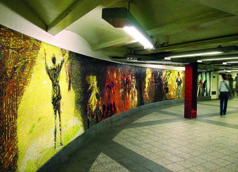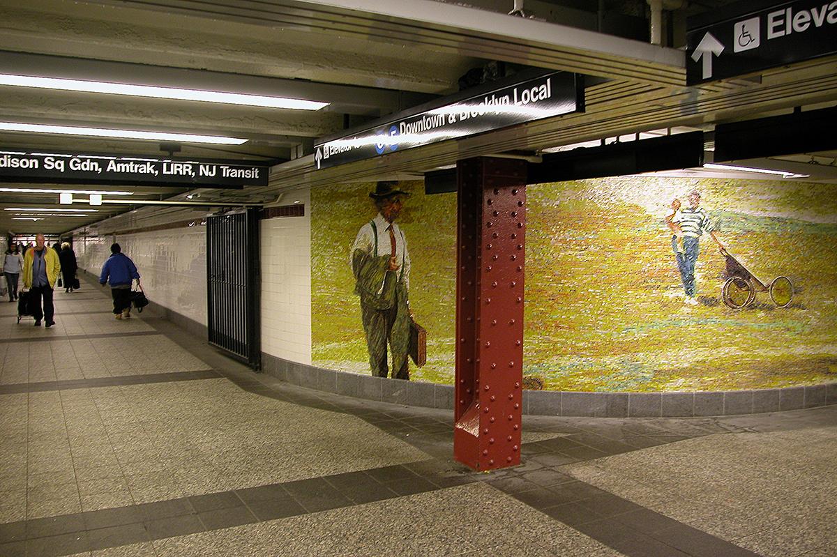 "The Garden of Circus Delights" is the artist's homage to the circus, which makes annual visits to Madison Square Garden, located above the station, and also connected to the Long Island Rail Road. Eric Fischl's work is narrative and this work follows in this tradition. A series of murals takes commuters from the familiar to the bizarre circus world. "I thought it would be amusing," Fischl says, "to do a contemporary Dante's 'Inferno,' to turn commuting into a spiritual quest." The murals portray fire-breathers, acrobats, and animals; gradually, one realizes that a commuter has left home and been pulled into the circus, where he meets incredible circus characters and then, on the other side of the tent, he emerges in the white light and harmony, a commuter again, but transported and transformed.