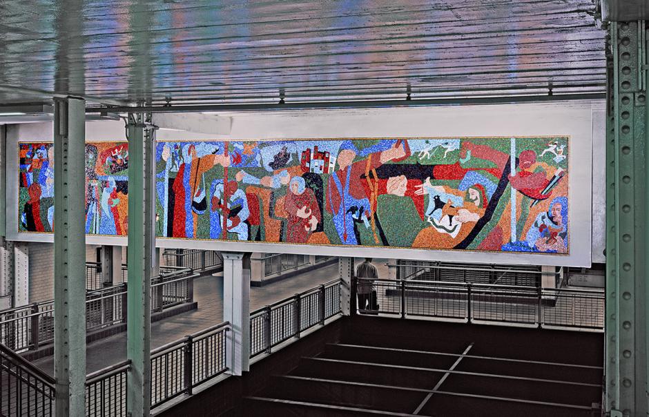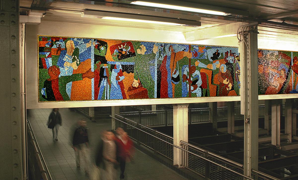 The enormous mosaic mural is the focal point of the mezzanine in the Times Square subway complex. Its shimmering and detailed surface pays tribute to the diversity and strength of New York City: Its neighborhoods, cultural life, recreational pleasures, love of sports and, of course, its subway system. "New York in Transit" was Jacob Lawrence's last public work, and in it, he evokes city life as seen from an elevated train. The sensitive and loving portrait shows a slice of city life and is a parting gift to New York City, seen by millions of people who live and visit here.