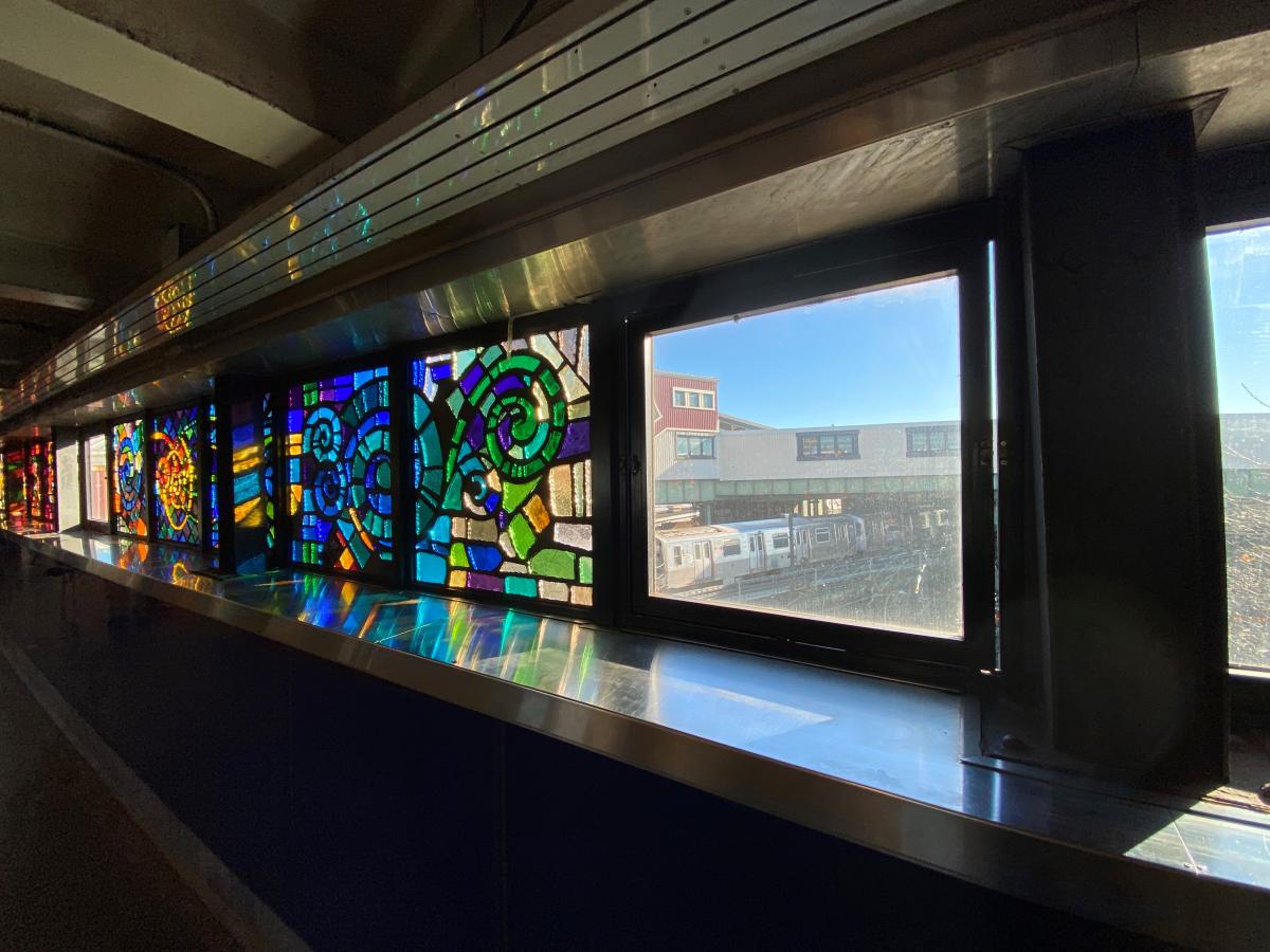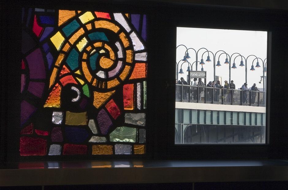“Brooklyn, New Morning” is an expansive work that consists of 75 unique glass panels arranged into a series throughout the complex and a seven-by-ten-foot glass mosaic mural wall. Al Loving said the work has a "spirit of interdependence and interconnection as an important aspect of the American experience," reflecting that this large station serves as a crossroads. Working with natural light, he achieves a lively and engaging atmosphere, and the colored light and flowing forms create a sense of optimism and well-being.