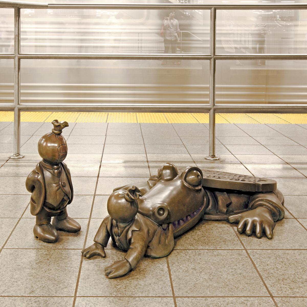 Otterness placed his creations in unexpected places-beneath stairs and pillars, hanging from the ceiling, and on benches and railings-to surprise and delight riders as they come upon these humorous and captivating inhabitants.