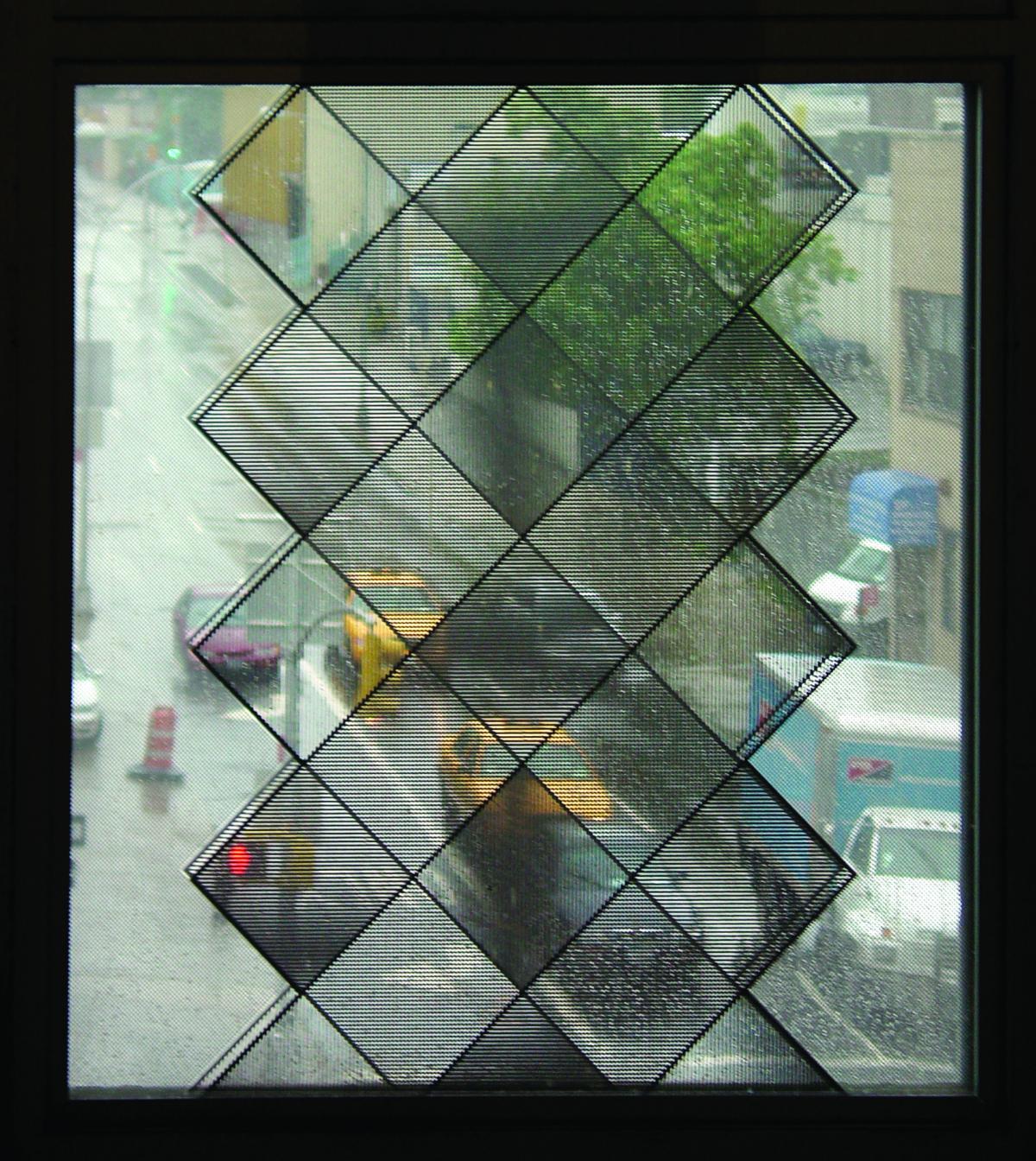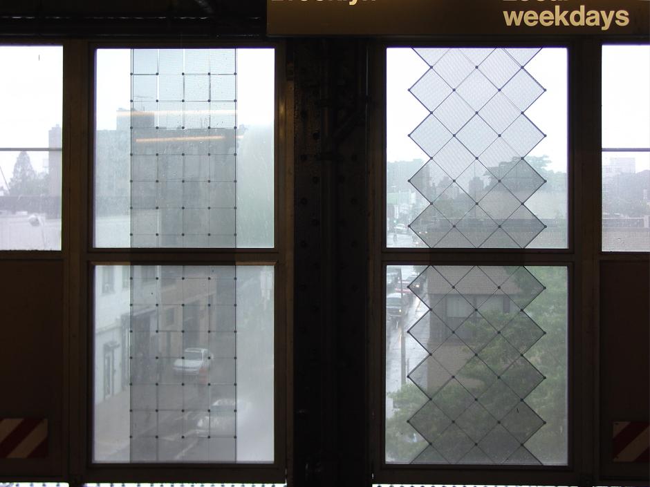 In describing his work and intent in creating the silkscreened glass panels, Sidney Cash says, "As viewers walks along the platform, they are able to watch the panels' imagery transform as patterns appear and disappear in response to their movement ...The patterns on the panels have been designed to relate to the style of embellishment of Arts and Crafts-influenced architecture. As parts of the building are enhanced by diamond-shaped tiles, so are the patterns on the optical panels based upon the diamond shape. The vibrancy of movement and the patterns in the panels create a visual dialogue between the Arts and Crafts style, the motion of the trains, and the high-tech world of today.... For the people who take the time to look, this installation becomes a moving exhibition."
