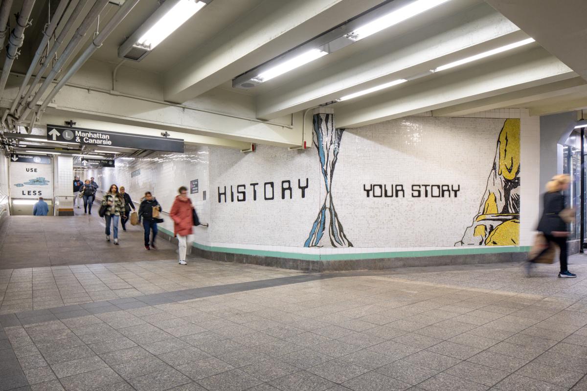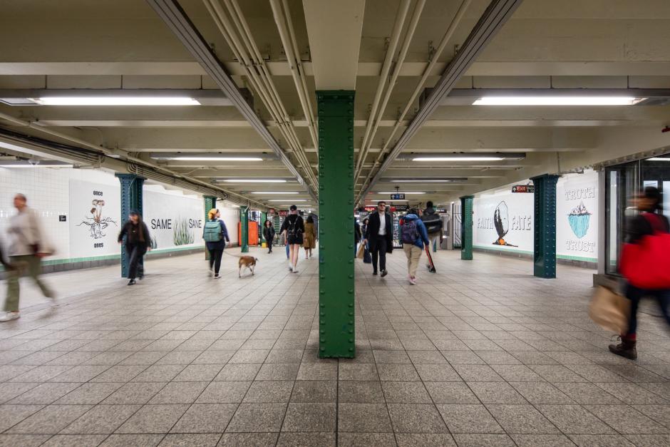 Constructed of glass and ceramic tile, Jackie Chang's “Signs of Life” offers text and images arranged as a puzzle throughout the station mezzanine. A rock sits atop a pointed shape between two words, "FAITH" and "FATE." Other words – "MAN," "KIND," "IT," "SELF" – are in the path of a cresting wave below. The artist seeks to spark the viewers' imaginations, perhaps hoping that interpretations will emerge over repeated viewings and rumination. The tone of the messages are enigmatic: are they optimistic or pessimistic; are they speaking of the past or to the future? "I kept my titles brief," Chang says. "I wanted them to be challenging." In a sense, these bits of what Chang calls "urban poetry" are an acknowledgment of the creative energy flowing through the community.
