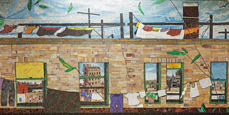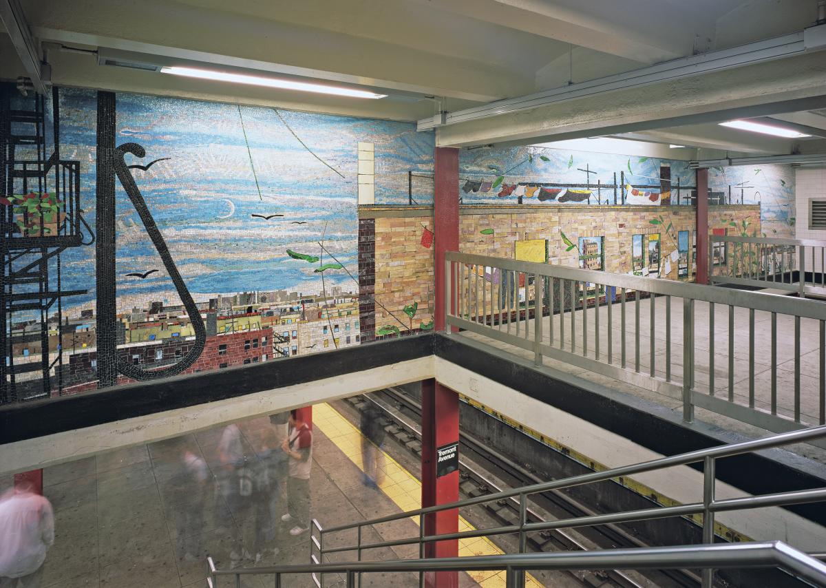 Uptown New York, a colorful, airy celebration of apartment life in the Bronx, is the centerpiece of the Tremont Avenue subway station's renovation. Drawn from his childhood memory, artist Frank Hampton created a tableau taken from the viewpoint of an actual rooftop location. The viewer, looking through a building, sees the neighbors' furniture, the continuing view of nearby rooftops, other apartment buildings, and beyond to the skyscrapers of Manhattan.