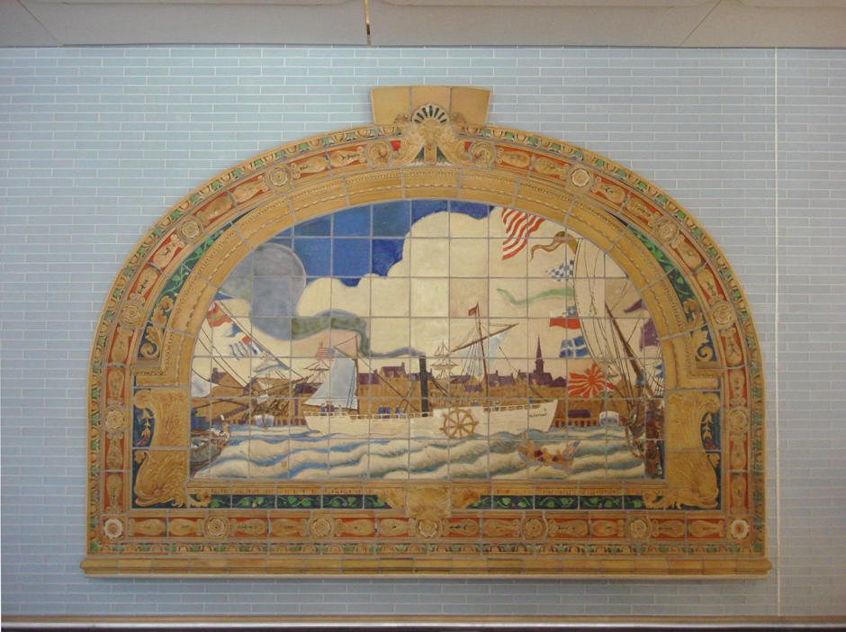 The Marine Grill Murals were created for the restaurant of the McAlpin Hotel at 34th Street and Broadway by artist Fred Dana Marsh in 1913, with maritime themes celebrating New York's important seaport. The subject matter ranges from Henry Hudson's ship to Fulton's steamship in NY Harbor. These terra cotta murals were so celebrated that the restaurant was later renamed "Marine Grill" - hence the title of the murals. In 1989, the McAlpin was being converted into a residential cooperative. NYC Landmarks Preservation Commission took possession of the dismantled terra cotta tiles and arranged for their storage. A decade later, MTA Arts & Design was asked by Landmarks if the murals could be incorporated into a New York City Transit subway station. With the help of designers and preservationists, six of the murals and the Marine Grill's famed ironwork entrance gate were installed in the passageway of Fulton Street/Broadway-Nassau station in 2000.