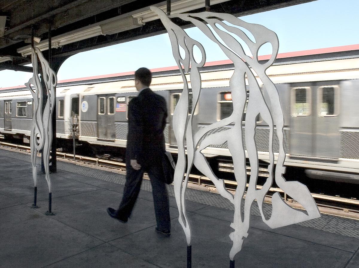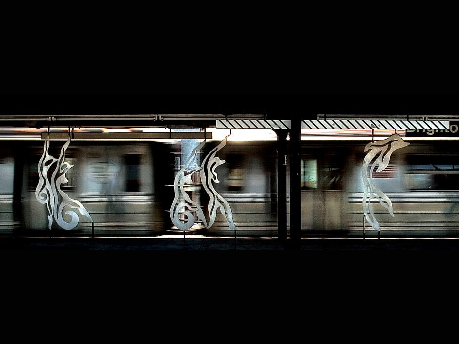 Brighton Beach, near Coney Island, was once one of New York City's prime seaside entertainment and recreation areas. "The sea is ancient, rich, and mysterious," says Dan George. "I wanted ‘Dionysus’ to intrigue people and to remind them of the sea's mythic history and thereby spark the creation of their own dreams and fantasies." Dolphins - six pairs and a singleton - are used by the artist to depict the metamorphosis from human to animal. These have a light and supple appearance, belying the materials from which they are made - sturdy, solid and durable aluminum plate and the way that natural light reflects off the water plays on the satiny polished finish and planes of the sculptures giving it buoyancy.