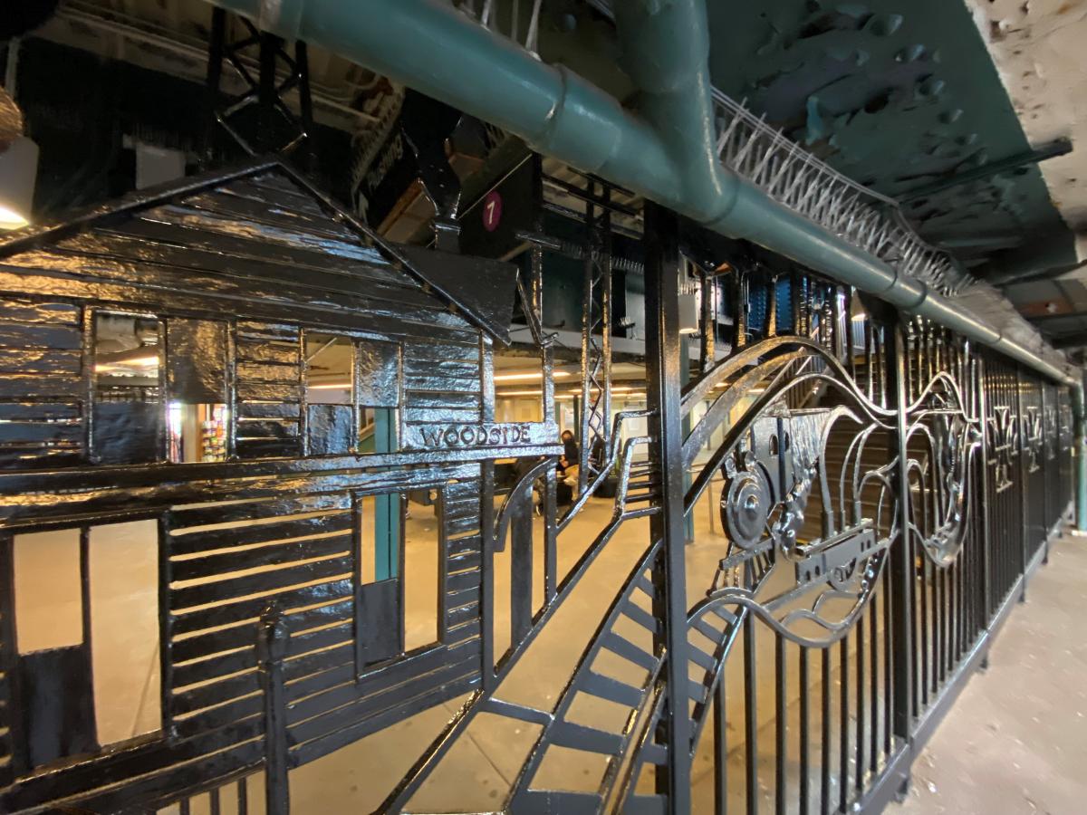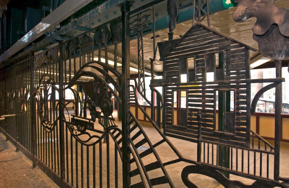 “Woodside Continuum” deals with the history of Woodside as a neighborhood, and its relationship to the railroad in particular. "The challenge and opportunity of the Woodside station is in its relationship to the past and to the future," Gerakaris explains. "In designing art for it, I wanted to create a continuum to link generations - starting centuries ago with wilderness, farms, country lanes, and abundant woods, to today. People rushing by may become aware of this now vanished town and, upon reflection, realize that they are the link to the future ... I wanted ‘Woodside Continuum’ to present history accurately but in an engaging way. My aim was to encourage people to think about the continuity and to see the ways Woodside has changed and is changing - and the powerful role transportation has played in that process."