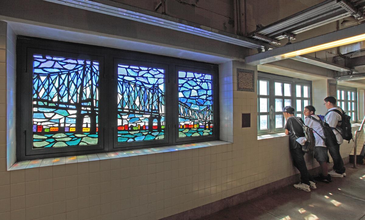 When the 7 train emerges from the underground to become elevated as its travels through Queens, it passes through a succession of stations in one of the most ethnically diverse areas of the city. The renovation of this line included a major work of art that pays homage to the borough of Queens and its diversity. Artist Yumi Heo designed 30 faceted-glass panels for the stations' mezzanines and platforms. Collectively titled “Q is for Queens,” the panels use each letter of the alphabet (e.g. A is for Aqueduct racetrack ... Z is for Zoo) to highlight neighborhood places and events, in a narrative that brings the richness of Queens to life, filtered through the artist's sensibility. 33rd Street-Rawson Street includes the letters A through J and two other murals, including one of a "Redbird" subway car and one depicting a typical storefront in Flushing. 40 Street–Lowery Street includes the letters K through P. 46 Street–Bliss Street includes the letters Q through Z and two other murals, including one of a typical neighborhood scene in Flushing, illustrating the cultural diversity of the neighborhood and of the White Stone Bridge that links the Borough of Queens to the Bronx.