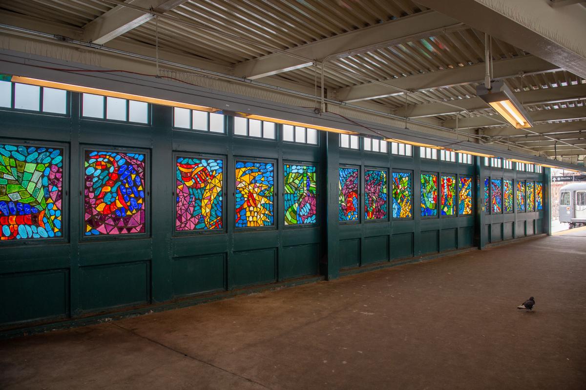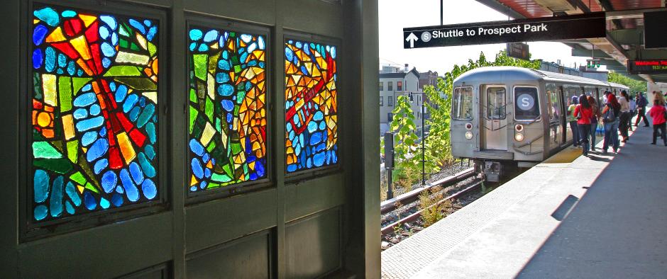 In “Life and Continued Growth,” Eric Pryor's 29 faceted glass windows use both traditional African and contemporary African American images. Antelope horns signify movement and are a symbol for material prosperity. Butterflies signify the life cycle, from gestation to birth to the change into adulthood. The importance of music and rhythm are shown through African drums, a saxophone, and trumpets, rendered in vivid red, gold, and purple in contrast to the receding shades of green, blue and turquoise. "The Franklin Avenue-Fulton Street area's rich African American heritage is being reborn," says Pryor. "Change and opportunity are arriving and the shuttle line both encourages and reflects how the community's new optimism. ‘Life and Continued Growth’ emerges from a spirit that is rooted in traditional African-American culture and the new energy that is making it soar again."