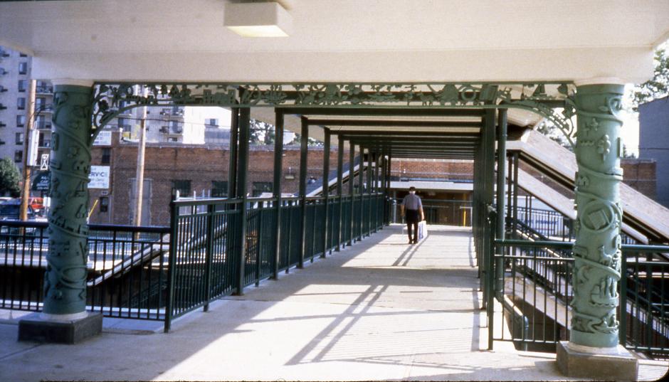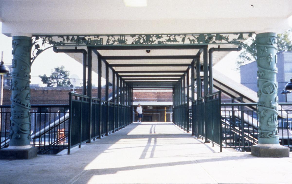 “Bayside Story” features spiral friezes that wrap around the support columns, bearing animal and floral motifs as well as bronze reliefs that celebrate local history and culture. Indians paddling a canoe have a central position in the work. Around them are a settler's homestead, a Revolutionary war soldier, a farm, and Fort Totten. Boxer "Gentleman Jim" Corbett represents local heroes; a yacht and checkered flag portray local amusements. Once home to the Native American Matinecocks, in the late 1800s, the wealthy built estates in Bayside. In the early 1900's, the community was the home to stars of the silver screen.