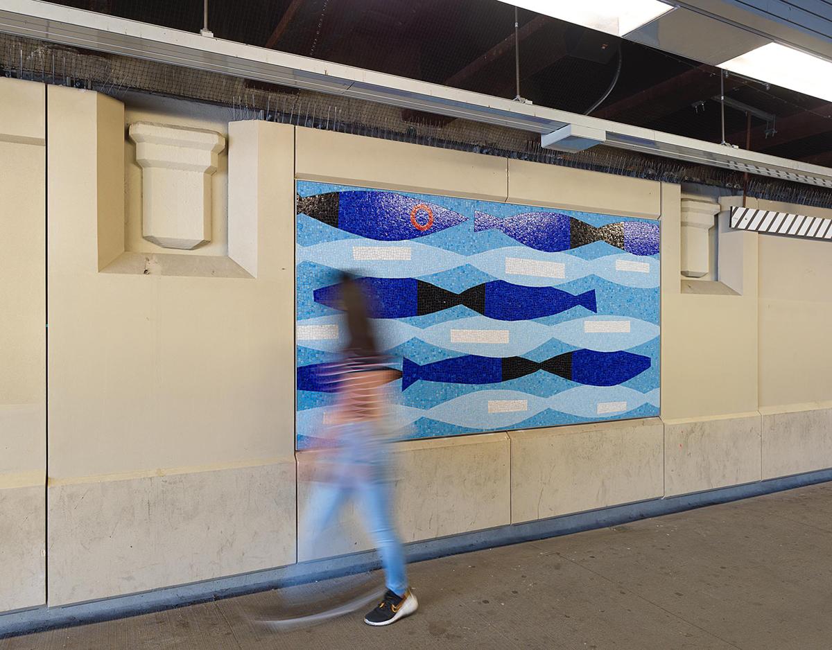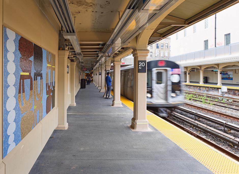 Storey was inspired by the constant sequence of changes seen in the view from the subway, as well as from the perspective of the station platform. The 14 artwork panels, fabricated by Mosaika Art & Design, echo a sensory feeling of motion and sequential transition. Rendered in a bright palette and filled with contrasts of color and form, the pieces create vignettes that weave together references of backyard windows, sidewalk market displays, and juxtapose nature with the urban environment. The multi-faceted and graphic artwork is a lively, celebratory and playful experience for the passengers that use the 20 Av station.