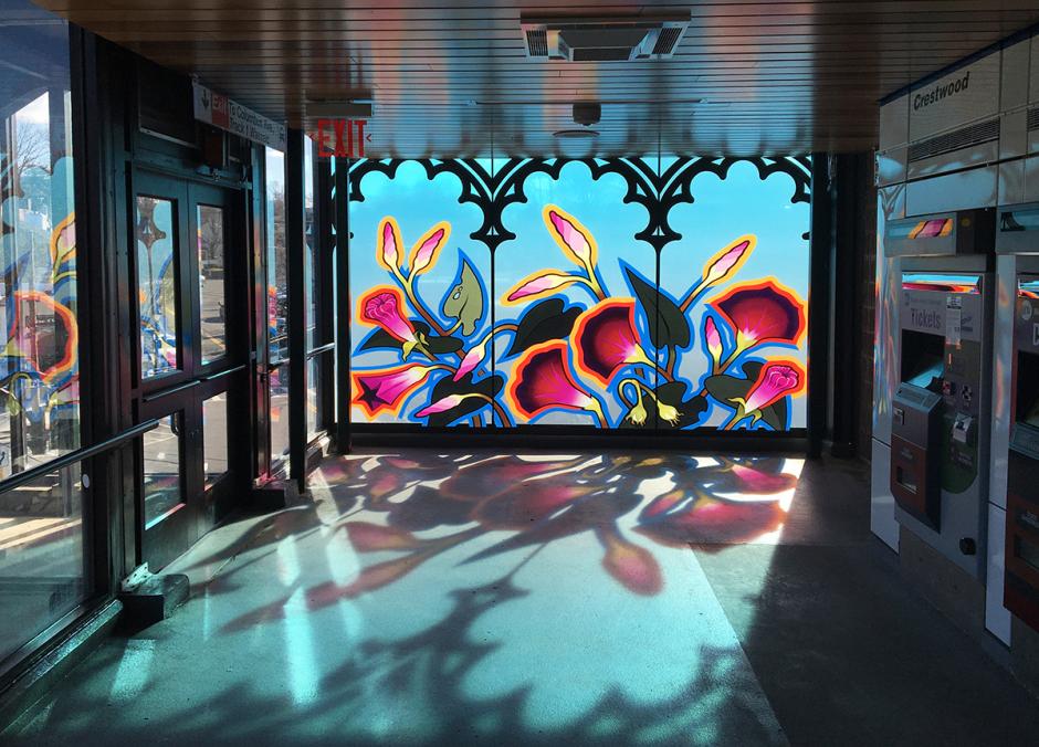 The laminated glass artwork, "Morning Glory, Evening Splendor," features silhouetted morning glories against a light, bright morning sky in the east window, and evening primroses glowing in the deep blue of an evening sky in the west. The east/west emphasis acknowledges the daily cycles of the morning commute and evening return, marking it as a physical and symbolic crossroads.