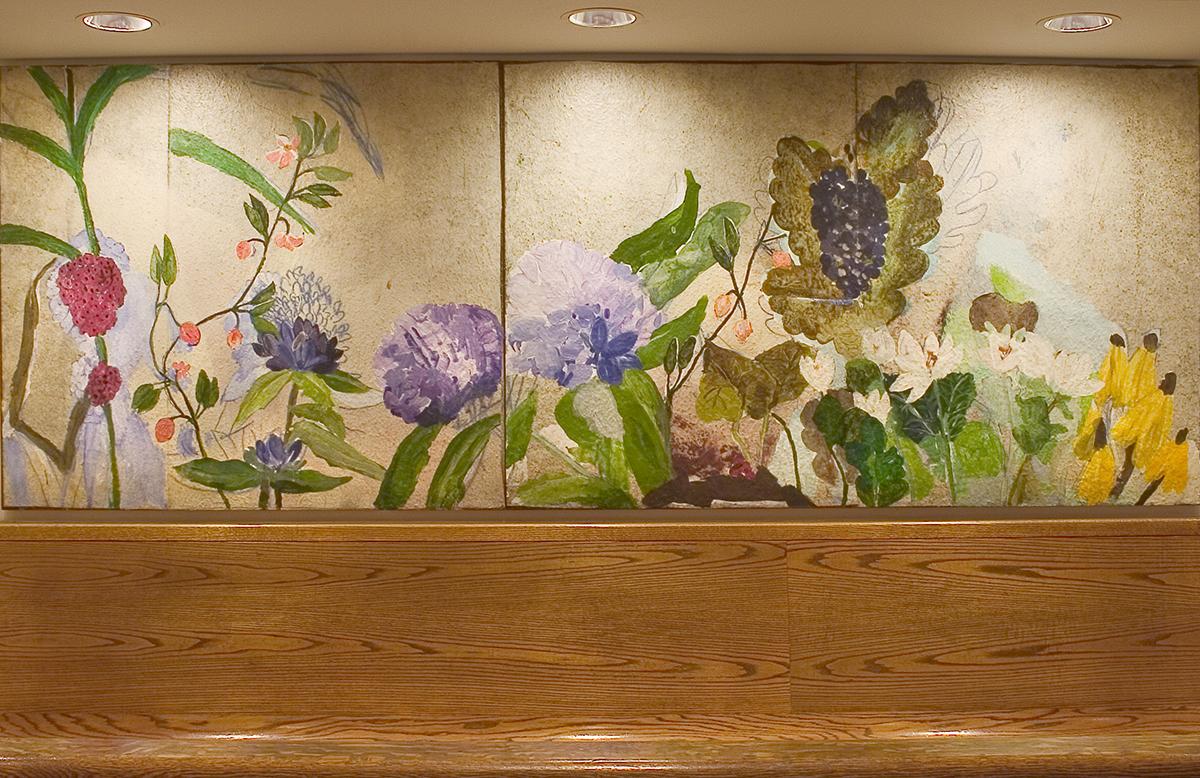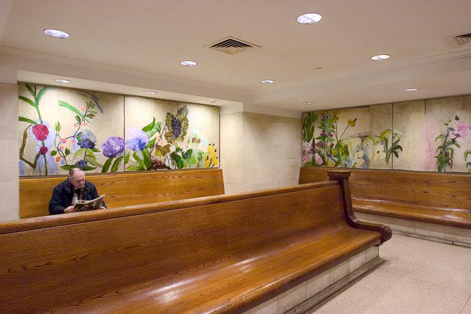 "A Field of Wild Flowers" was created to be compatible with the architecture of Grand Central Terminal, and it repeats some of its historic interior details such as the representation of fruit, acorns, and garlands. It also provides a contemporary work of art that stands on its own, bringing a touch of serenity to the surrounding whirl of activity.