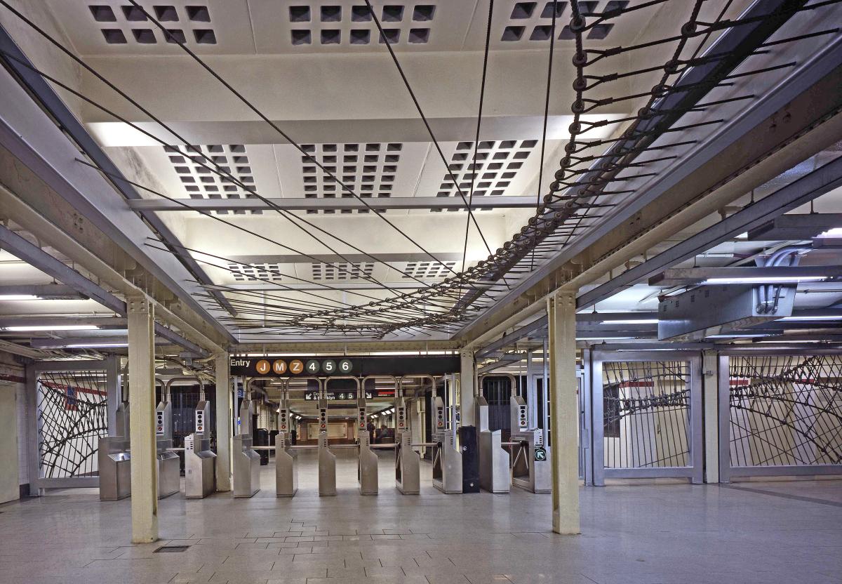 The Brooklyn Bridge's pioneering use of steel cables and a suspended roadway are repeatedly referenced in the design of artist Mark Gibian's work. Within the west mezzanine a web of cables recalls the graceful forms of the bridge, while overhead a 30-square foot structure, suspended beneath a skylight, frames the cable work. At the turnstiles, three panels that also use cables serve as a functional barrier. For the artist, the "lacy" curves of the panels "echo the beauty of the bridge's cross-hatched cables and the feeling of flight as it springs across the East River." The energy of “Cable Crossing” suggests "the controlled power of the subway and its network of metal and concrete that undergirds the city. I wanted to explore movement, using soft curves with hard materials," Gibian says.