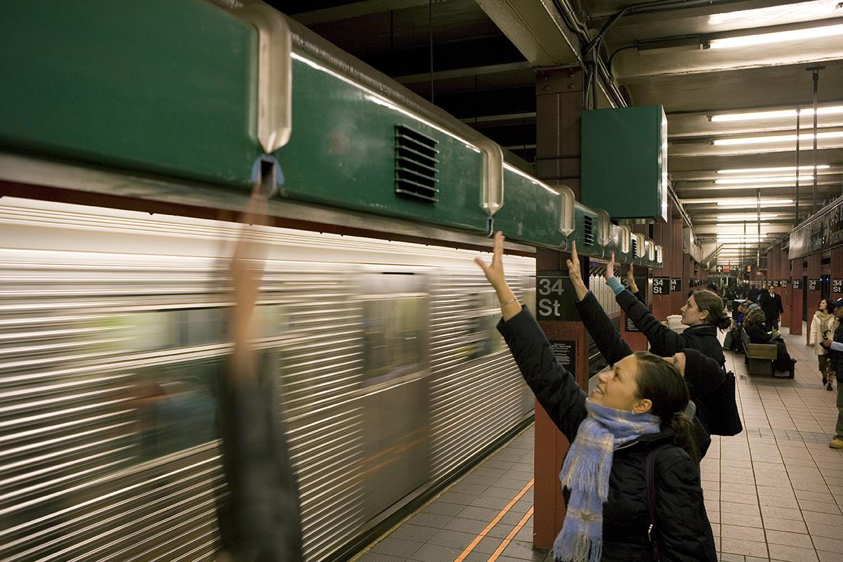 A green painted rectangular structure is suspended from the subway platform and engages travelers with its ability to produce sounds. Travelers place their hands in front of the box-like apparatus on the subway platform and a burst of musical notes are released on the opposite side, playing to the person on the other side. The hand motions elicit an outpouring of sounds that evoke urban life and bring about duets between strangers waiting for their respective trains. Artist Christopher Janney creates sound sculptures and public art that use sound and motion. This work brings about interaction and pleased participants, serving in Janney's words, as "a foil for getting total strangers to interact with each other."