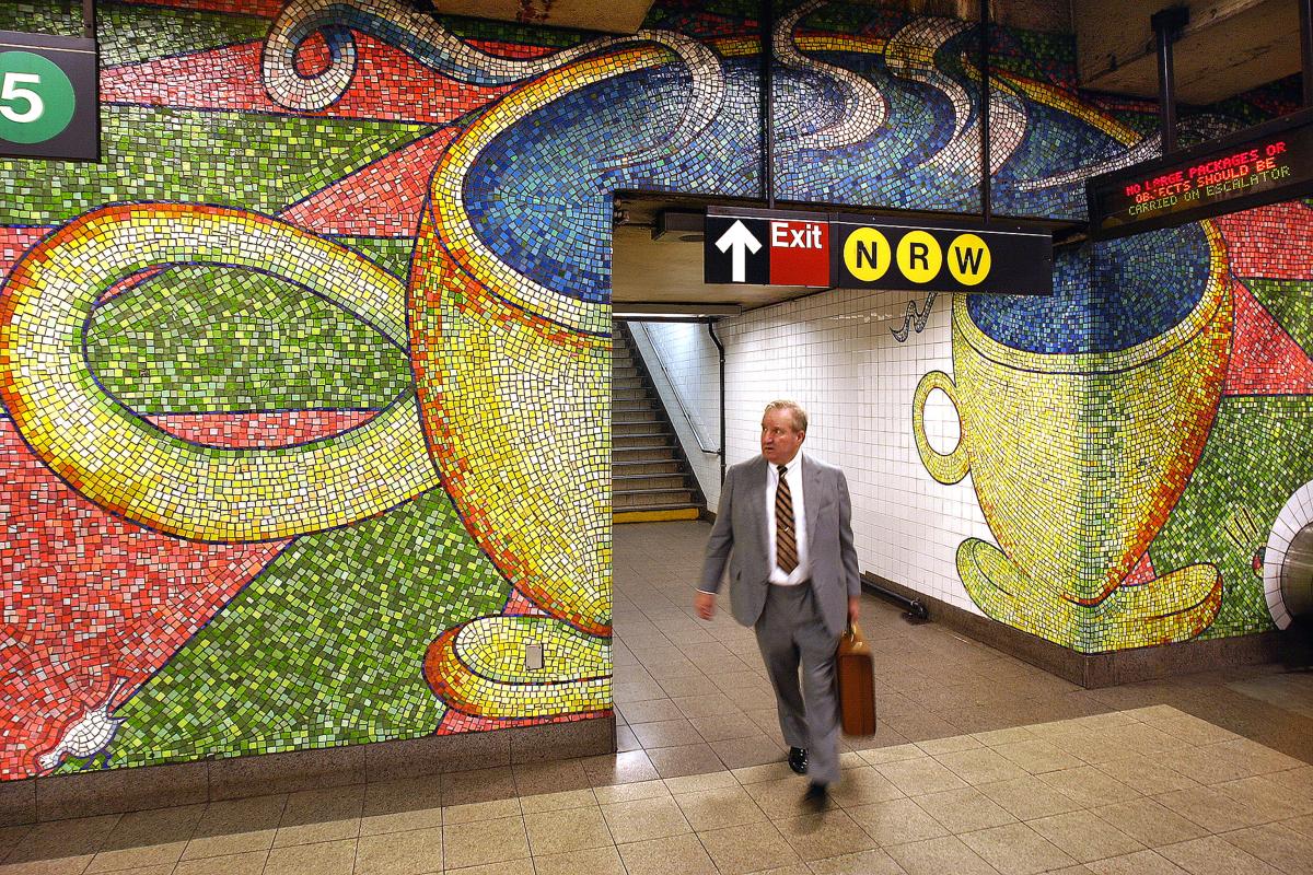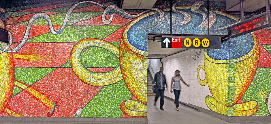 “Blooming” takes its title from Bloomingdale's, located above the station upstairs. The artist views the subway as a "dreamy underworld" and also a place to wake up, and her pink trees, red shoes and yellow mugs with steaming coffee succeed in gaining the viewers' attention. Murray says, "I added the stepping shoes and steaming coffee cups, part of the ritual of every morning or evening subway trip." The images are intended to "stimulate thoughts about passage, as does the poetry" that is incorporated into the mural, lines from William Butler Yeats's, "In dreams begin responsibility," Gwendolyn Brooks's "Conduct your blooming in the noise and whip of the whirlwind."