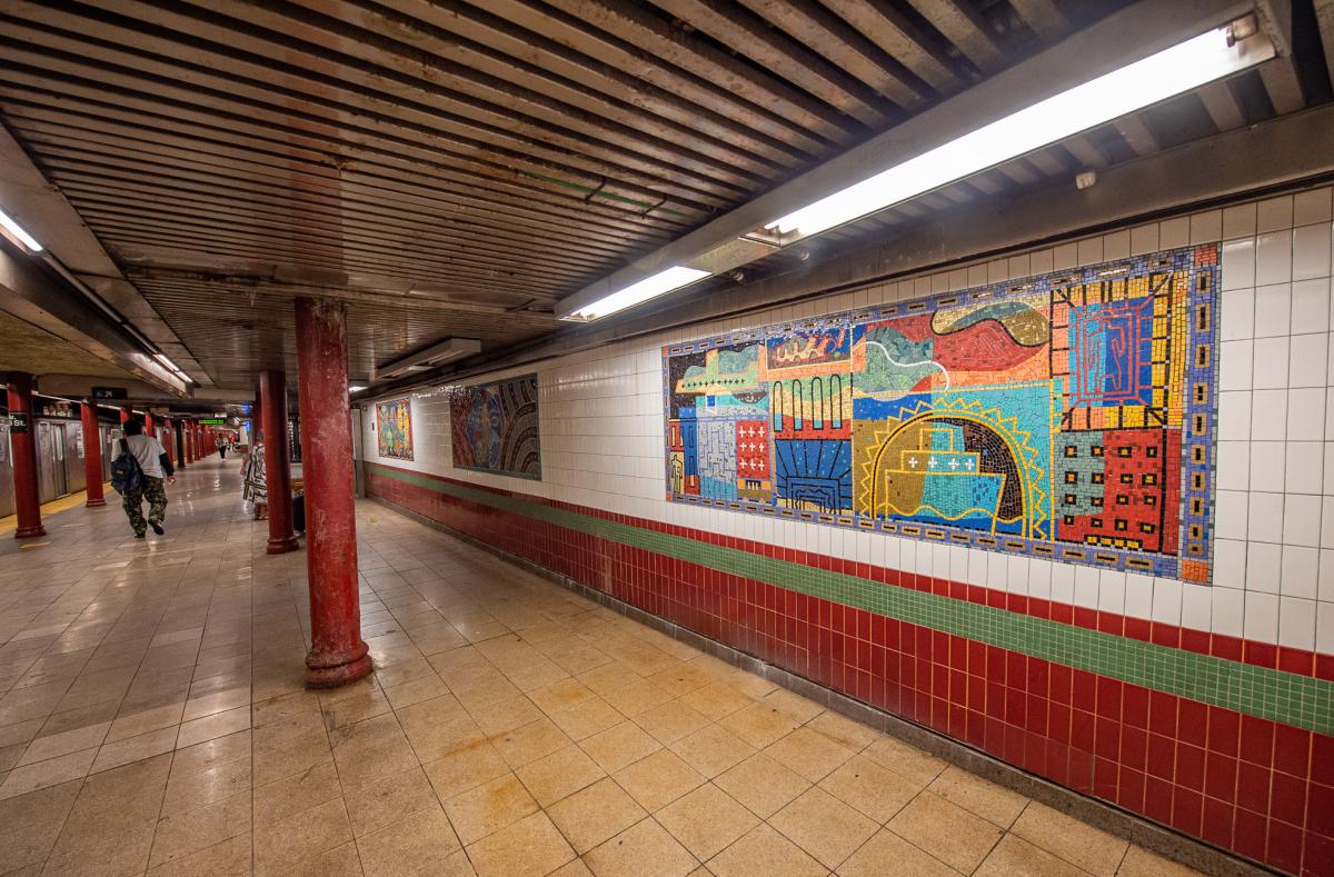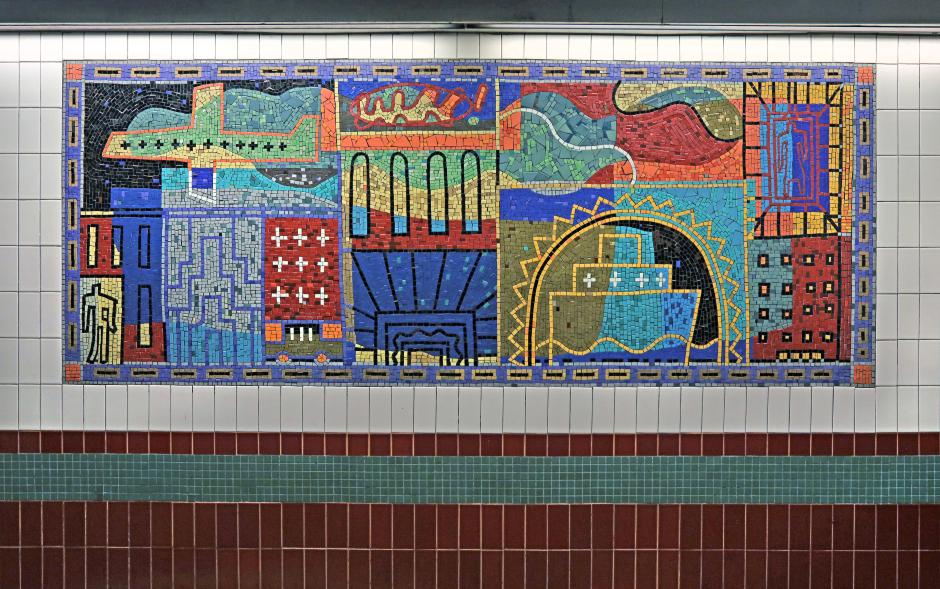 José Ortega created a series of mosaic panels inspired by the busy circle of streets above the 149th Street station, referred to locally as "the Hub." Ortega uses circular forms to invoke universal themes and creates recognizable imagery within an organic and abstract web of patterns. "The circle is a powerful symbol," he says. "It connotes infinity, implies wholeness. It has no beginning and no end." His brightly colored murals focus on three circular images: "the sun as the provider of energy and the center of our universe, the earth as the sustainer of our humanly developed and natural worlds, and the face as the translator, both receptor and interpreter of the human and natural worlds."