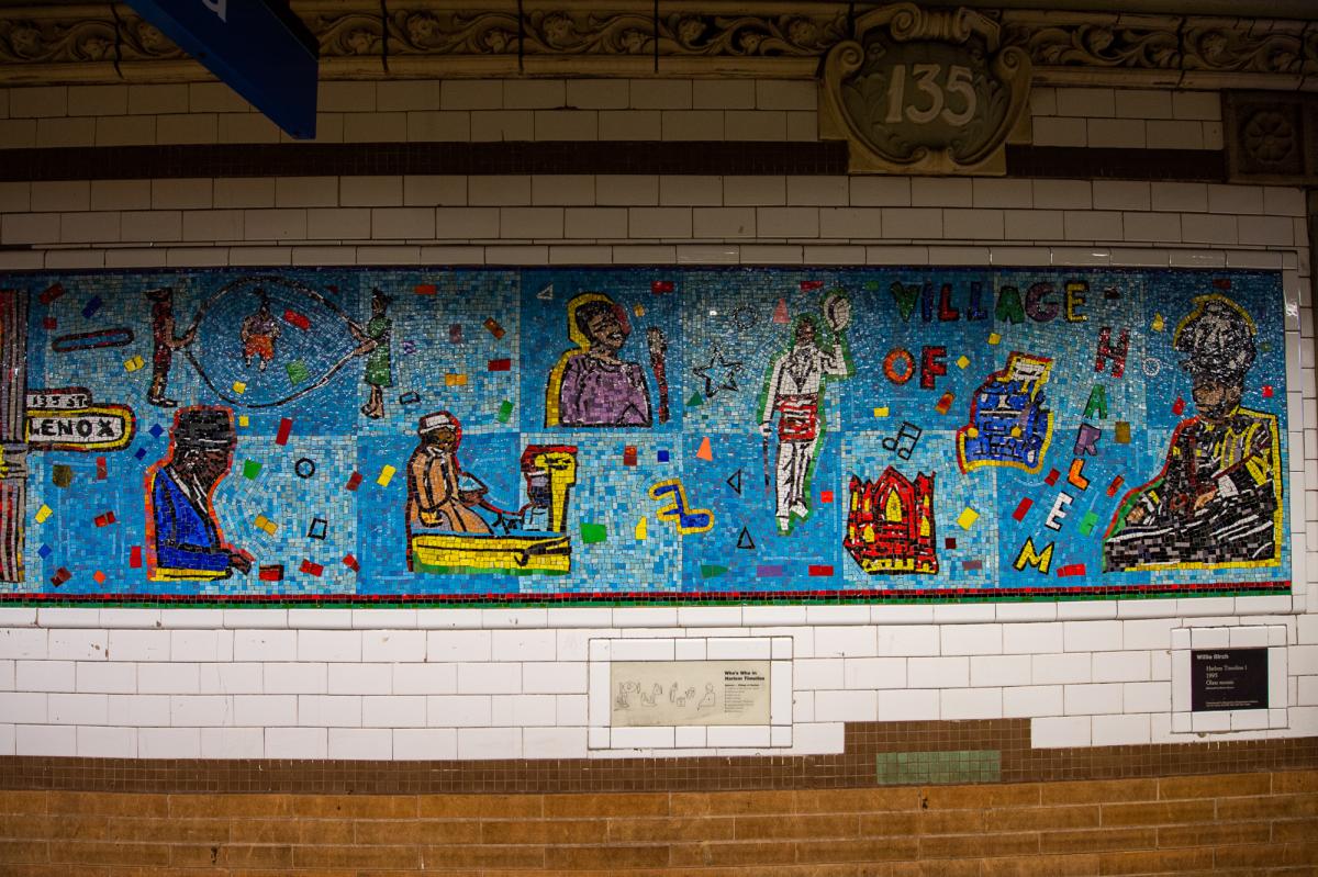 “Harlem Timeline” serves as a tribute to Harlem luminaries. In this expansive mosaic mural, they are seen mingling with neighborhood residents. On the downtown platform, we see Reverend Adam Clayton Powell Jr., Langston Hughes, Joe Louis, and Charlie Parker in action. The blues - both the musical form and the color - are represented on the uptown side, with Billie Holiday, bathed in indigo. Elsewhere, Malcolm X, Marcus Garvey, Paul Robeson, John Coltrane, and Thelonious Monk express themselves, rejoining the community where the Harlem Renaissance all began. Some of the visual references that Birch weaves into the work are African-American quilts, textile designs of Mexico and Africa, and visionary folk art.