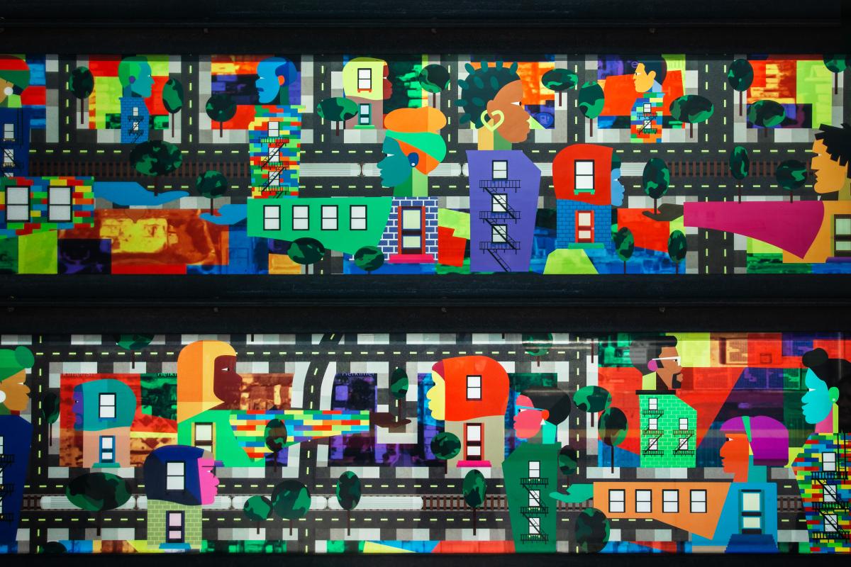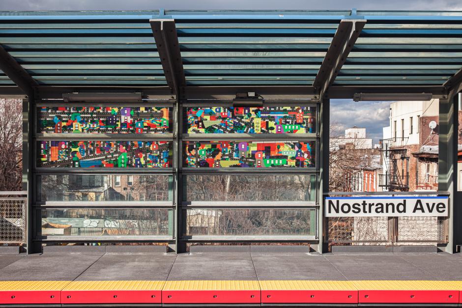 "Around the Way" by Derrick Adams presents a bold and playful depiction of city life throughout LIRR Nostrand Avenue Station. The laminated glass artwork consists of 85 panels that span the length of the newly rehabilitated platforms and extend onto four new pedestrian bridges that connect the station to Crown Heights and Bedford-Stuyvesant, which are represented in the artwork.