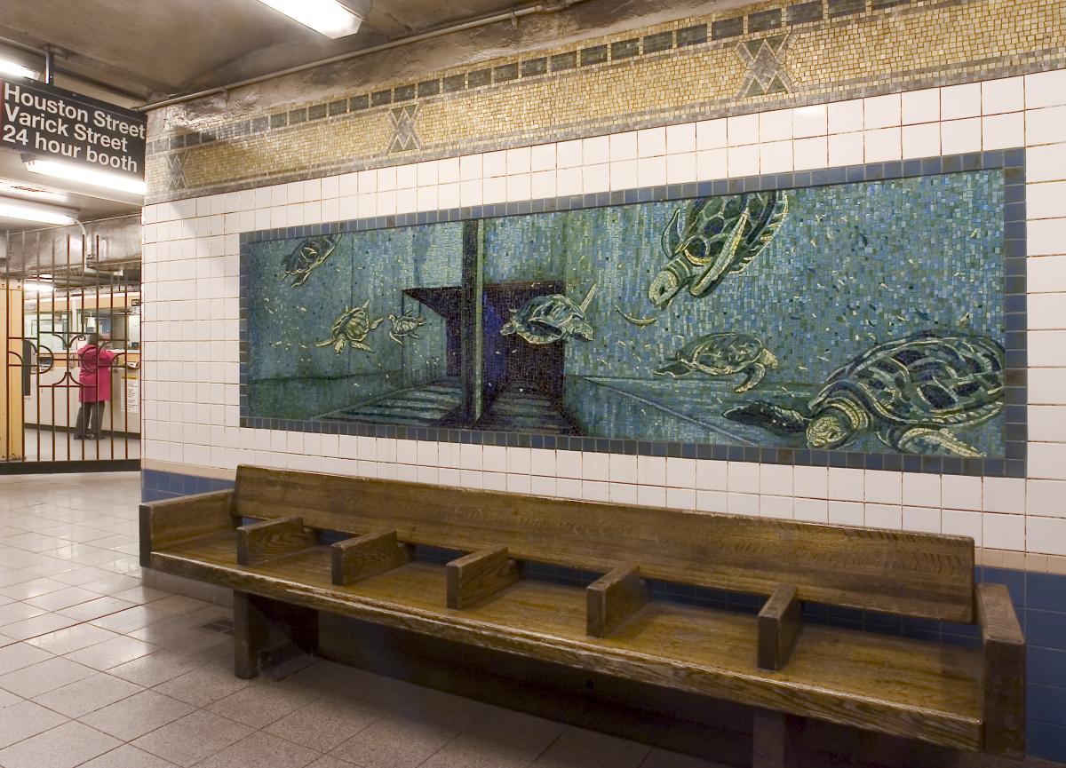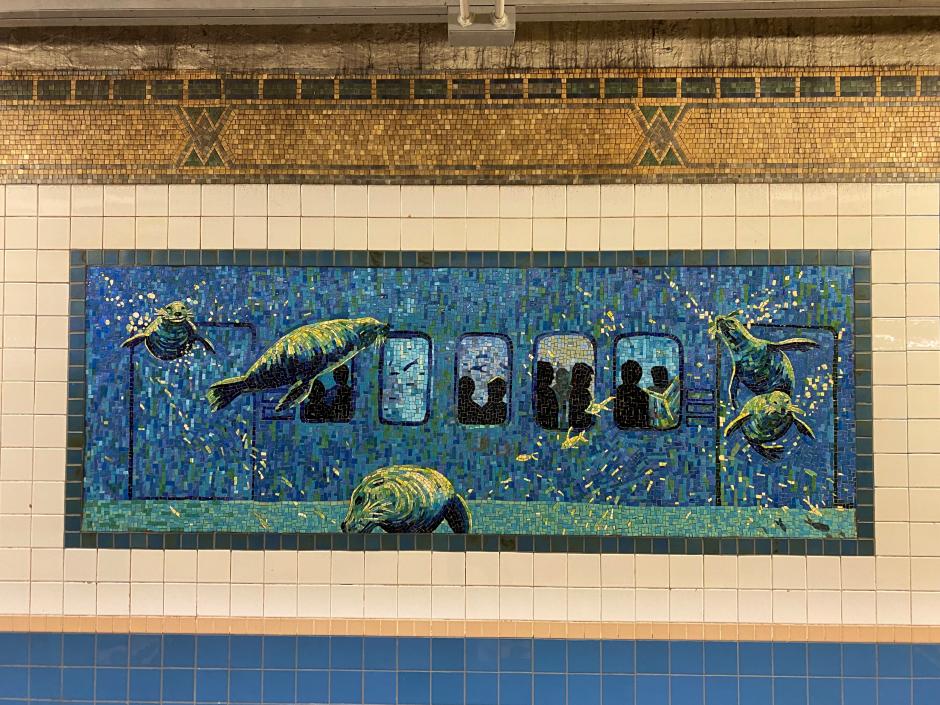 Brown's seven glass mosaics are given a whimsical quality, as the artist creates aquatic creatures that act like humans as they wait for the train to arrive at their underwater station. A realistic beluga whale slides behind a commuter to read the newspaper headlines, and in another scene, a manatee waits patiently for a train seen approaching in the tunnel. Turtles dive off a subway platform in the title piece of the series. "I wanted to explore the analogy between subway travel and the movement of our fellow creatures through their natural environment," Brown says. "Underwater creatures navigate a complex spatial array of undersea passageways, much as we maneuver through our own manmade systems. I thought it would be provocative to portray them in a part of our world most closely resembling their own, but involved in activities familiar to us."