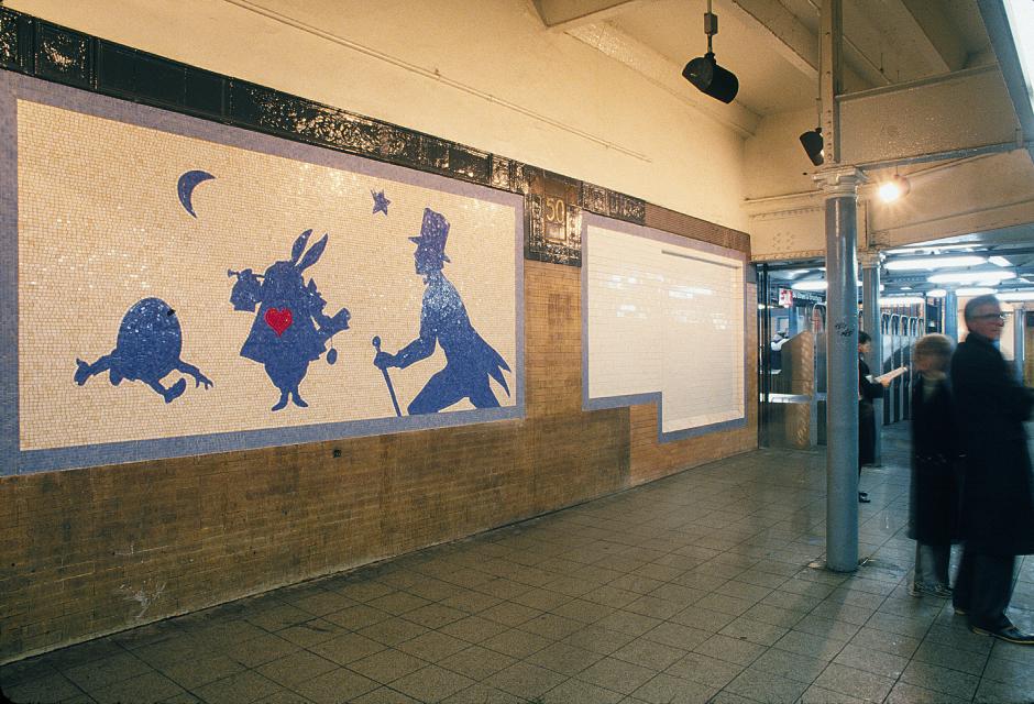 In this series of mosaic panels, titled Alice: The Way Out, Liliana Porter's silhouetted figures portray characters from Lewis Carroll's Alice in Wonderland. The simple and engaging quality of the works echo the stagecraft found in the Broadway theaters nearby. The artist evokes the idea of the theatrical and playfully connects it with the experience of being underground, as was Alice during her adventures. Commenting on what is below the surface, Porter shows Alice pulling back a curtain to reveal the drama. Porter prefers to let the viewer's imagination fill in the details of her shadowy figures, playing on our varying views of reality while entertaining her captive audience.