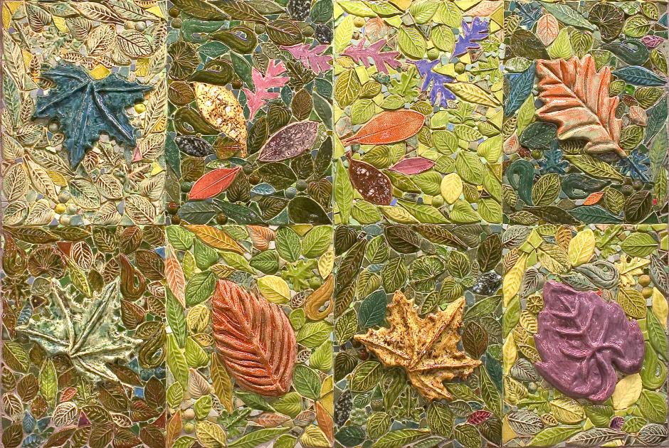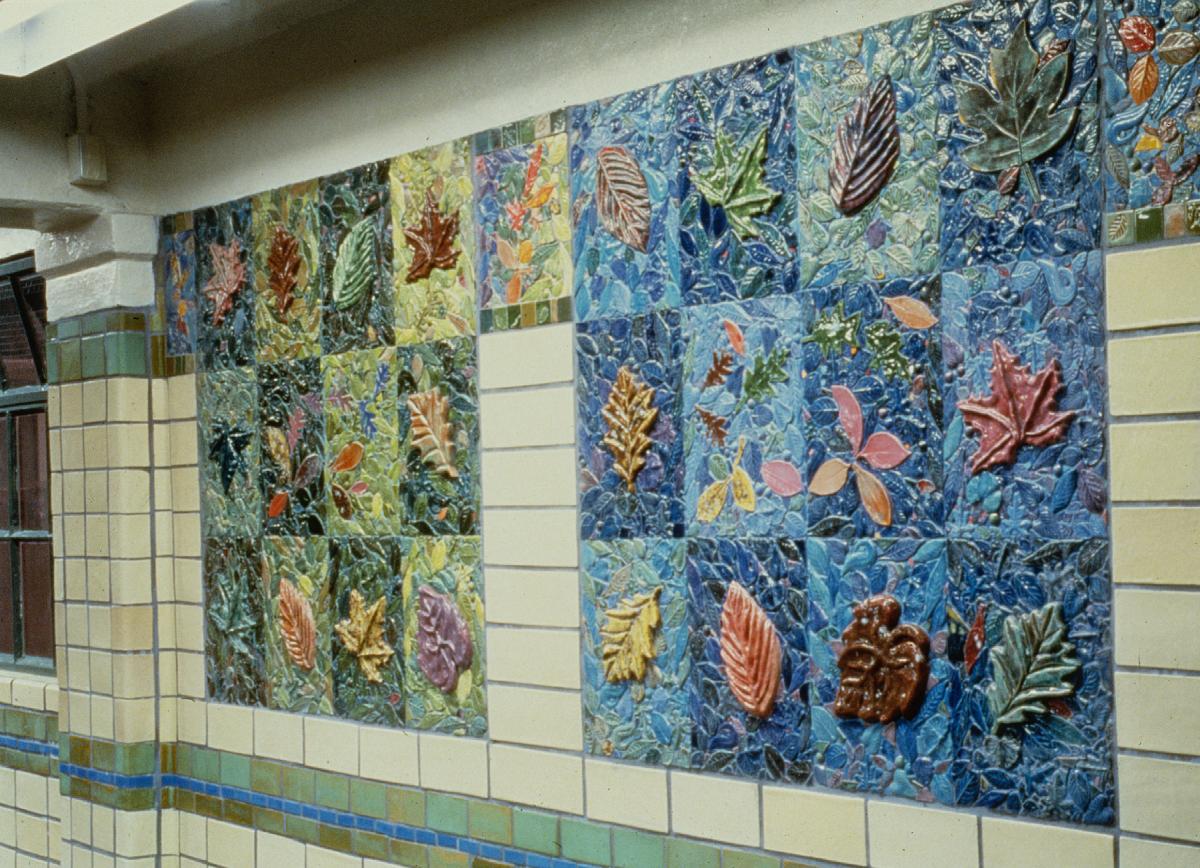 Tunick says her works for the sites, collectively titled “Brighton Clay Re-Leaf, Nos.1-4,” balance her respect for the stations' "ceramic history," her recollection of the colors and shapes of the foliage in the park and garden, and her desire to add eye-catching modern design, which is achieved in her use of bold color, pattern, and texture in the tiles.