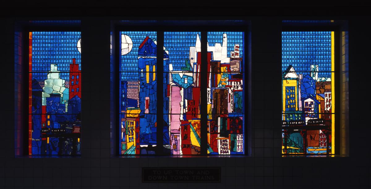 The hundreds of brilliant facets of Romare Bearden's glass triptych pulsate with energy, connected by the black thread of a subway train wending past tenements and skyscrapers. The work began as a collage maquette; this was then transformed into a glowing artwork in jewel-like colored glass. The three-paneled work is installed on the wall at the stairway landing.