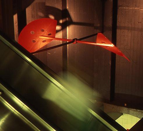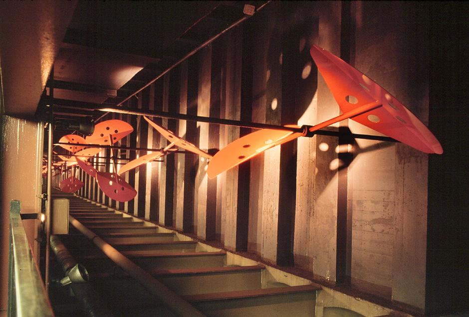 A series of red wind paddles, each 12 inches long, hangs between the east wall of the station and each of the 14 columns that run the length of the wall. The artist's concept was for the delicately balanced paddles to spin and flutter in the wind generated by approaching and departing trains. From the artist's proposal: "As every veteran subway rider knows — whether actively or intuitively — the approach of a train is preceded by a gust of wind funneling down the track. It's my interest to build and install a series of subway 'wind paddles' that will utilize and make visible these subterranean breezes. The varying amounts of wind will set the brightly colored paddles floating, tilting, and spinning in descriptive patterns."