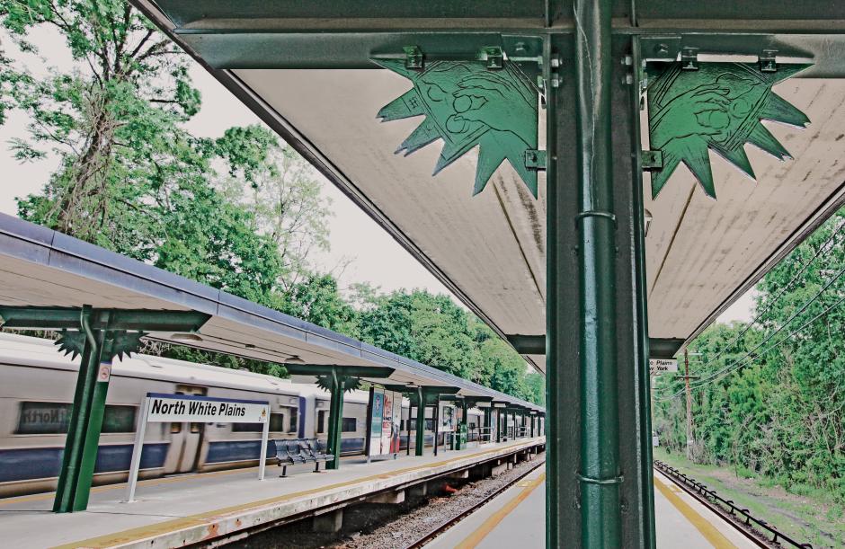 The artwork at North White Plains station is a series of cast aluminum sculptures in low relief along the platform's columns. The artist Rolando Briseño's unusual architectural treatment of the column capitals complement the North White Plains station's architecture while creating an eye-catching and surprising array of everyday objects that are etched into the sculptural forms as symbols. These are completed by six black architectonic pieces that combine these symbols- which include parts of a table, fruit, hands, and other body parts, and even televisions. "I depict these symbols that we use and see every day in movement to reflect our relation to time and existence; everything, including ourselves, is made of atoms, always in movement," Briseño says.