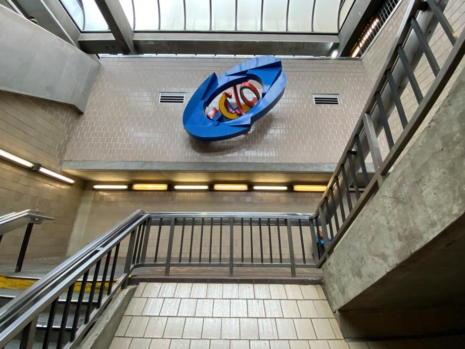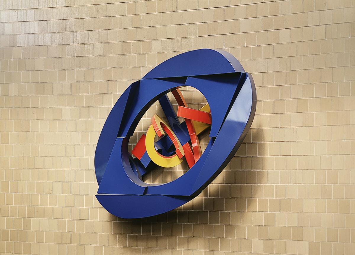The wall sculpture consists of two elements, a large ellipse and an armature that holds it, constructed of aluminum plate with deep welds. Sam Gilliam has long been interested in sculptural and theatrical work that interacts with the space it inhabits. He began draping his canvases and this led to his public sculpture such as this piece, where aluminum has taken the place of a canvas. In the artist's words, the work "calls to mind movement, circuits, speed, technology, and passenger ships...the colors used in the piece... refer to colors of the respective subway lines. The predominant use of blue provides one with a visual solid in a transitional area that is near subterranean."
