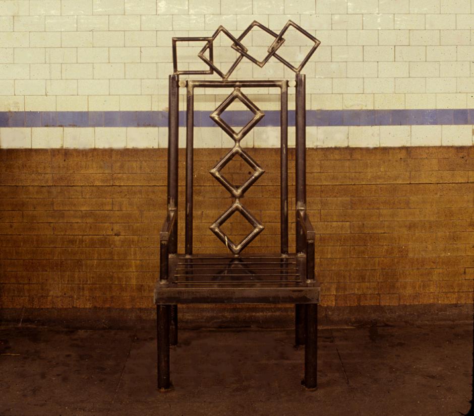 With this artwork, an oversized and grand chair made of steel, artist Michelle Greene introduces humor into the station. The chair's design echoes subway motifs and achieves the subway founders' design mission to make the subway a pleasant and hospitable place. "I wanted to create a whimsical environment that allows the commuter to feel special as opposed to alienated," says the artist. "I believe that art in a public space has the potential to stir people from their daily routine." Rider comments show that the art succeeds in doing so, as transit users engage in conversation and interact with the chair while waiting on the platform.