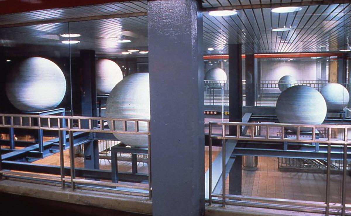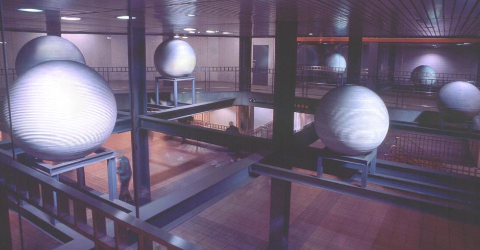 In the 34 St-Herald Sq subway station, riders are met by large, luminous orbs that seem to hover in space. Made of coiled aluminum rods that are formed in a manner similar to the way in which ceramicists build pots from clay, the spheres are suspended on a framework of small beams from the larger steel structural components of the station. "Halo" contrasts the aesthetic with the utilitarian and the result is "an unexpected serenity." The artist says, "It was my aim to create an enigmatic distribution of objects that would stand in sharp contrast to the rectilinear nature of the site, and in doing so, to establish an oasis of visual language amid an otherwise functional environment."