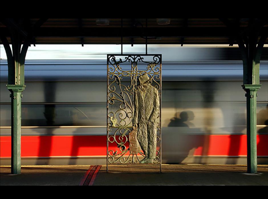 In Saar’s words, “these pieces … create a simple narrative of two people. One, the young woman coming to the city in hopes of advancing her career; the other, a successful businessman leaving the city to return to his hometown. I believe these two scenarios to be examples of how many Americans have used the railroads to and from New York throughout history. Yet I was also addressing the specific and rich tradition of the role of the railroad in general in the lives of African Americans.” A third figurative sculpture of a train conductor is located at the top of the platform stairs.