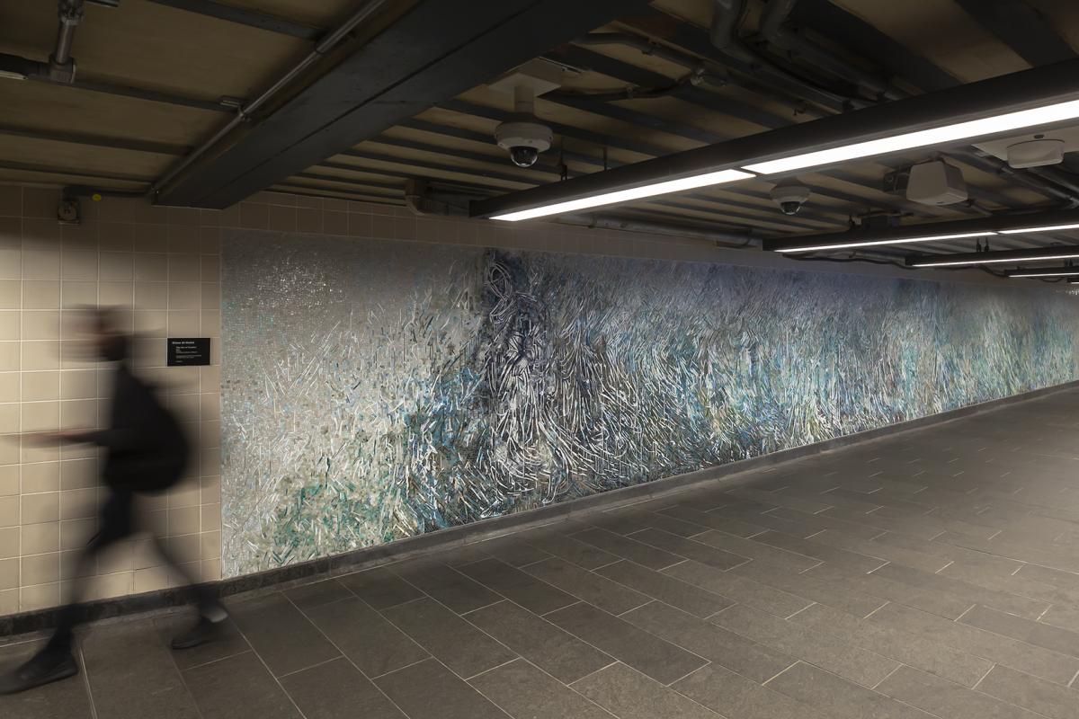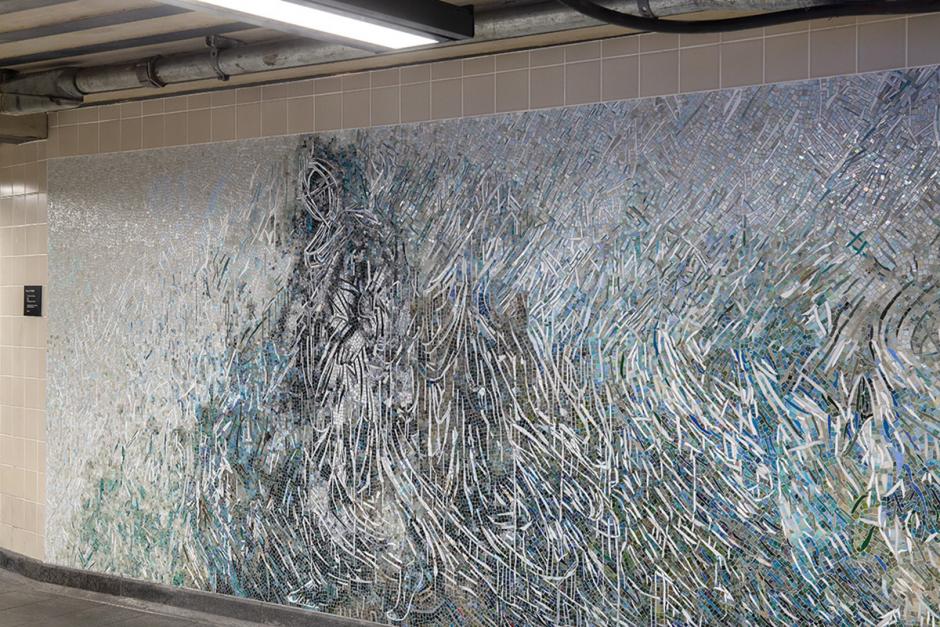 The glass mosaic artworks installed at 34 St-Penn Station on the Seventh Avenue line are Diana Al Hadid’s meditations on the unique history of Penn Station, and are a reflection of its transient atmosphere as one of New York City’s immense transportation hubs.
