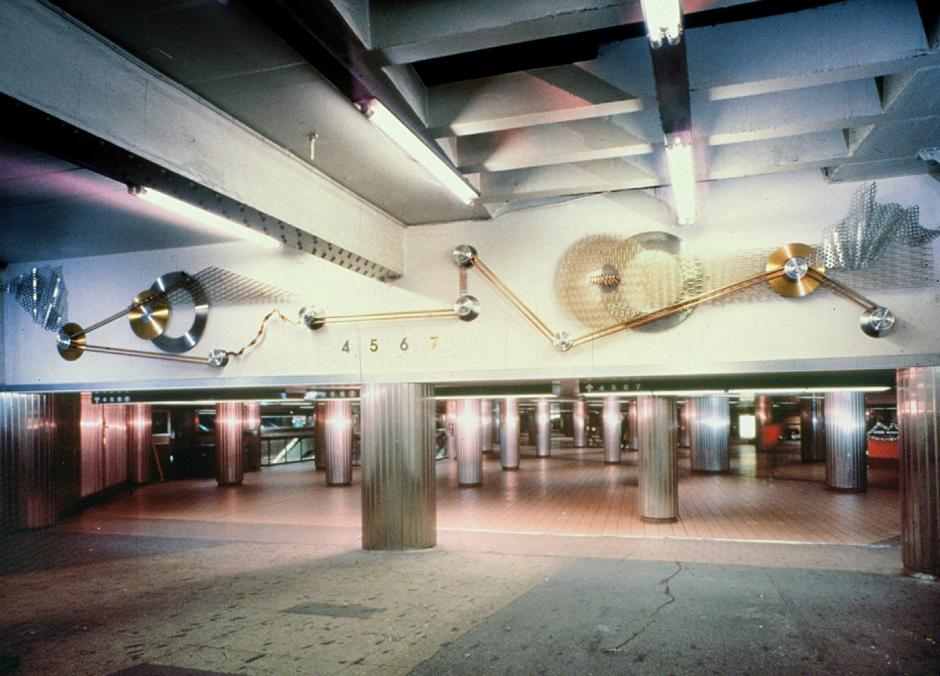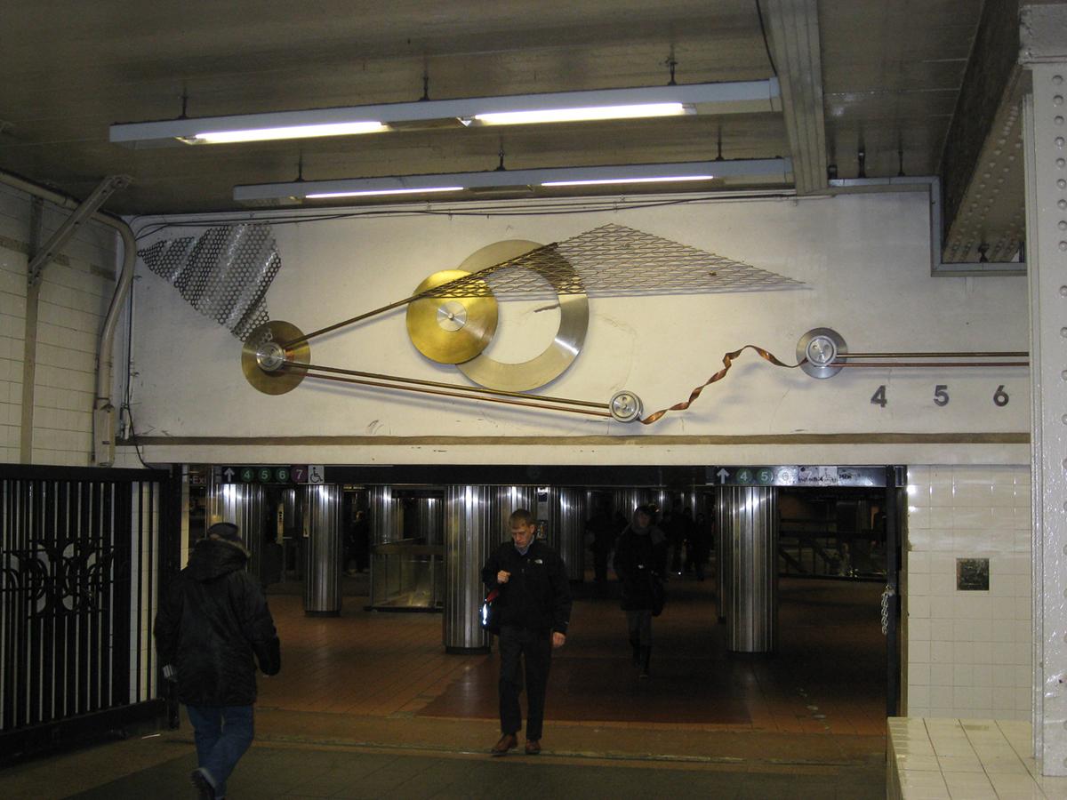 Daniel Sinclair's "Fast Track and Speedwheels" is an assemblage crafted from bright metallic sections that include wavy aluminum sheets, steel wheels, brass disks, copper springs, and wires. Installed within a long passageway between the subway and Grand Central Terminal, the pieces interpret the speed, energy, and train travel imagery into a series of relief sculptures. The Art Deco shapes and various turning wheels, spinning gears, and pistons add to the aura of the location, below one of America's premiere rail stations. "I want my sculpture to make people think of the power of the engines that drive the trains, the speed and efficiency of them," the artist says. "The sculptures also reflect the architectural elements of Times Square and the Art Deco glamour of Radio City Music Hall."