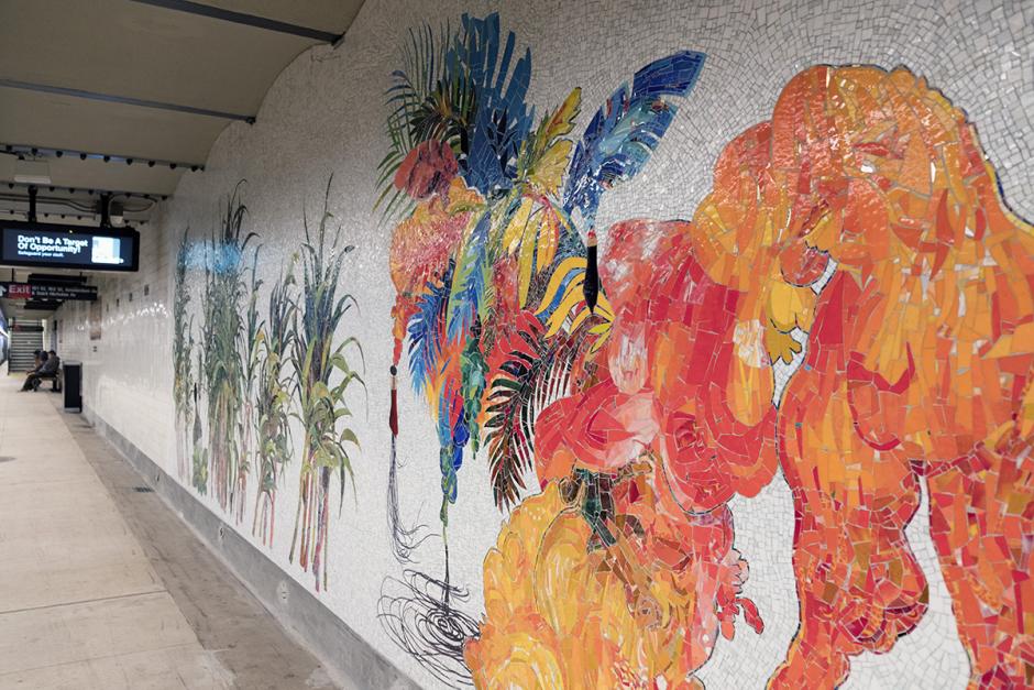 Glass mosaic artwork by Firelei Báez for the 163 St-Amsterdam Av station includes two platform wall murals and two mezzanine level murals, translated into glass mosaic by Mayer of Munich, and creates a lively and lush environment within the station.