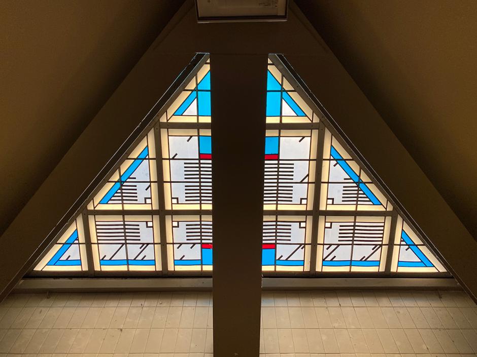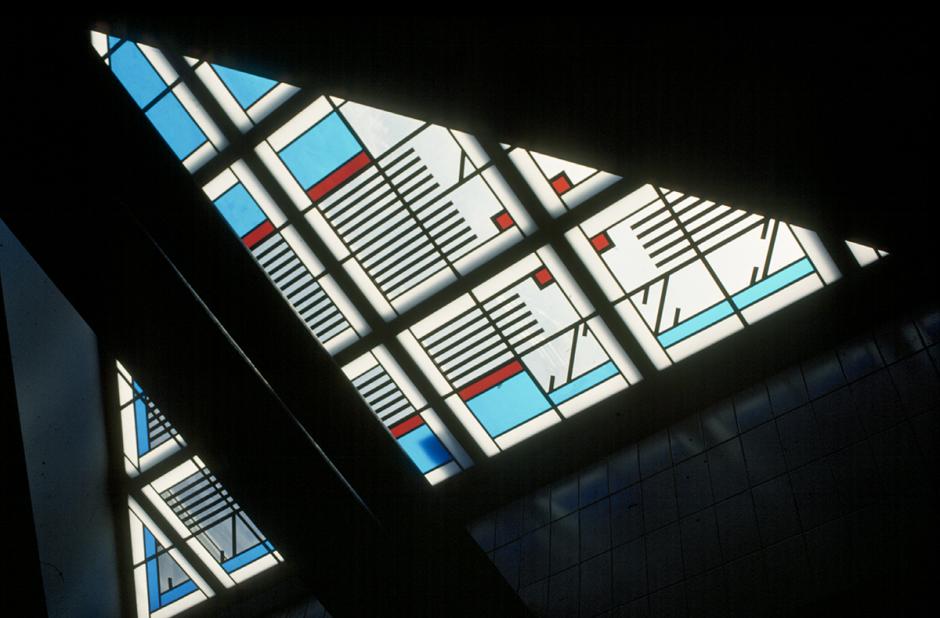 David Wilson's skylight fills the waiting area of this Brooklyn subway station with bright, clear light. The panels are framed in blue and the pattern in the panes consists of black lines and solid panels in geometric form, that echoes the aesthetics of the Arts and Crafts movement and leaded glass work from that era, but with a more contemporary interpretation. "I had been interested in the use of plastics and the possibility of 'leadlines' that are not feasible in glass — thus the diagonal 'cuts' going to nowhere in the piece (i.e. stopping in the middle of a color)," Wilson says. "The project is a kind of architectural statement — a skylight set into a difficult environment (a steel I-beam divides the triangular window into two halves so that it is hard to read as a whole)."