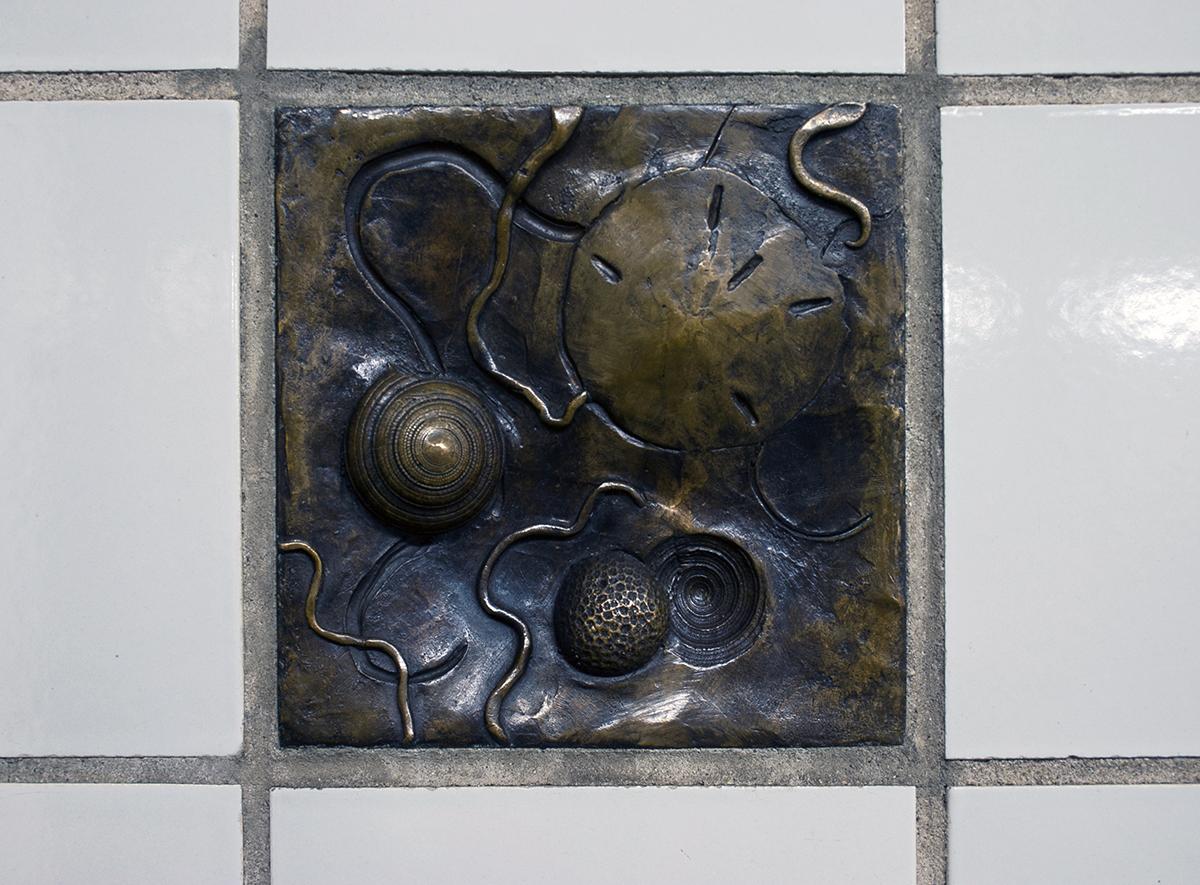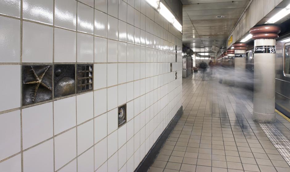 Steve Wood's artwork consists of 160 eight-by-eight-inch bronze relief tiles (80 each on the uptown and downtown platforms) that have been placed within the platform walls of the station. The tiles portray the fossilized remains of a variety of biological life forms. The artist's intent was to bring to the surface, in a subterranean public space, an exploration of the nature of what is found underground, usually through excavation. "The idea behind Fossils is simple: the subway is underground, fossils are found in the earth," the artist says. "I wanted these reliefs to be 'scattered' over the walls of the northbound and southbound platforms in such a way that both children and adults would see them personally and close-up. They are meant to be looked at, touched, talked about, and remembered."