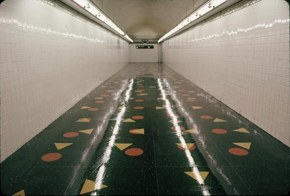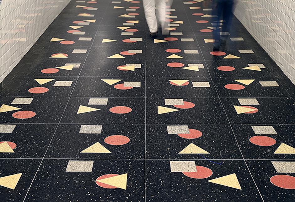 "Clark Street Passage" is an intriguing artwork within the floor of the station that uses three geometric shapes — circles, squares, and triangles — against a black background. When customers walk down the passage they are exposed to all the configurations that can be made from these basic elements, which create a flowing sense of movement. The study of constantly shifting geometric patterns is derived from artist Ray Ring's earlier work which was heavily influenced by early geometric abstract art from the early 20th century.