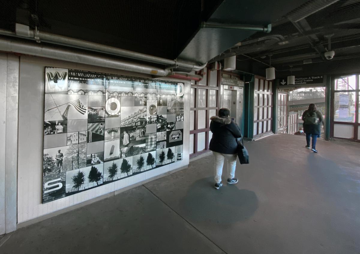 "Commuting/Community" reflects John Cavanagh's impressions of Woodside, a Queens neighborhood where railroad and subway lines intersect. The two photo-montage murals are related to one another in revealing the daily life of Woodside's residents. Both murals spell out "Woodside" using letters based on neighborhood sites. The murals reflect the contrasts present in this city neighborhood, from the rushing train overhead to the pleasant street life below. In another scene, the artist juxtaposes children playing in the park with adults commuting into the city. The portrayal of the community is offered to Woodside, in Cavanagh's words, "to provoke, stimulate, console, strengthen, and enjoy."