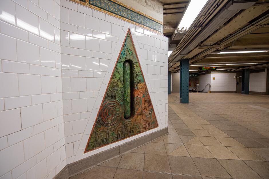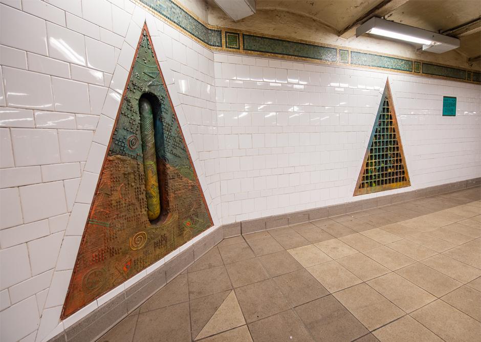 "The Open Secret," a series of bronze reliefs mounted on the mezzanine level, was the first MTA Arts & Design commissioned work in the subway, and it presents many of artist Houston Conwill's longstanding thematic concerns: community, history, and the creation of sacred spaces as each relates to the African American experience and quest for equality. "The Open Secret" holds mysteries, and viewers can look inside at the objects within. Two triangular sections serve as a time capsule of life in Harlem in the 1980s. "The exploration might be of a place or into our own minds where we find eternal secrets that are saved and put in the time capsules for our children and their children," Conwill said.