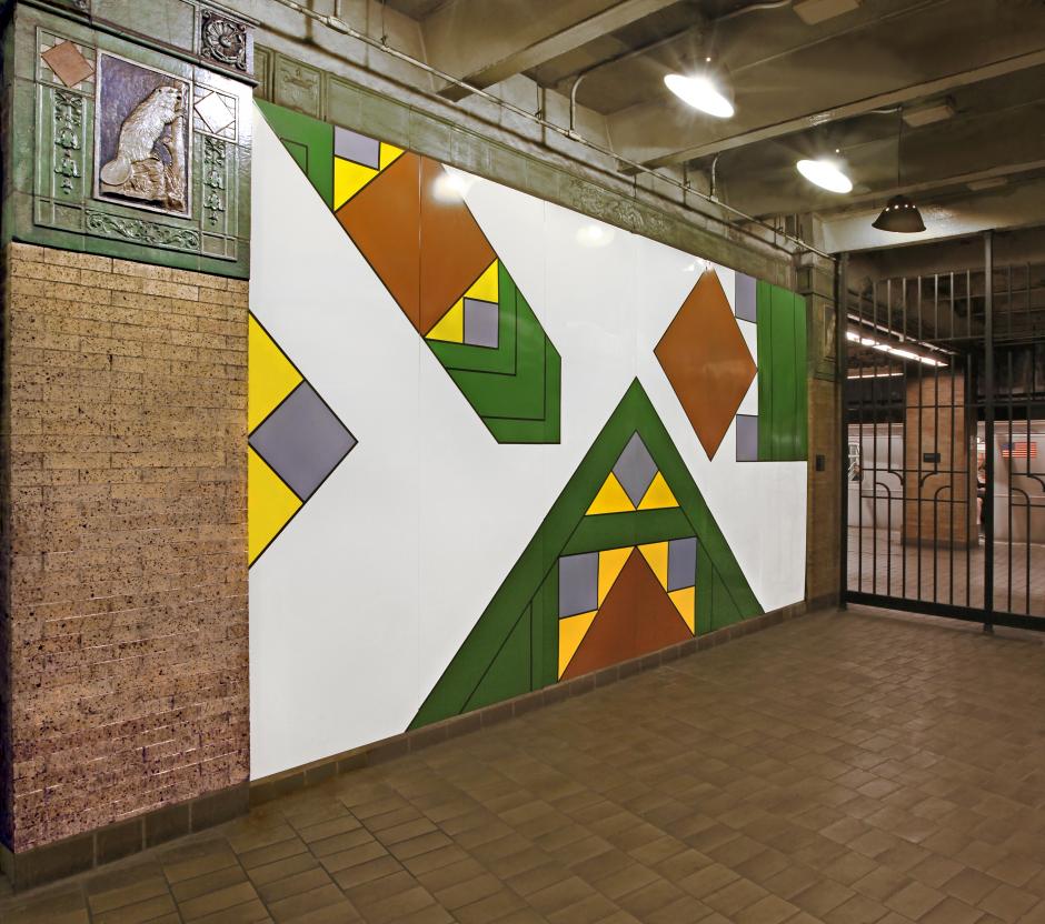 Glaser described his approach as, "basically a variation on the existing forms. By extracting fragments of the motifs on the tile panels, enlarging their scale, and placing these pieces in a random pattern, they take on the appearance of a puzzle." The result is a series of porcelain enamel panels in geometric patterns and color that echo the historic elements but present them in an entirely new way.